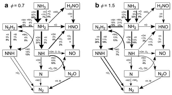 - Glarborg, P.; Miller, J.A.; Ruscic, B.; Klippenstein, S.J. Modeling nitrogen chemistry in combustion. Prog. Energy Combust. Sci. 2018, 67, 31–68. [Google Scholar] [CrossRef]