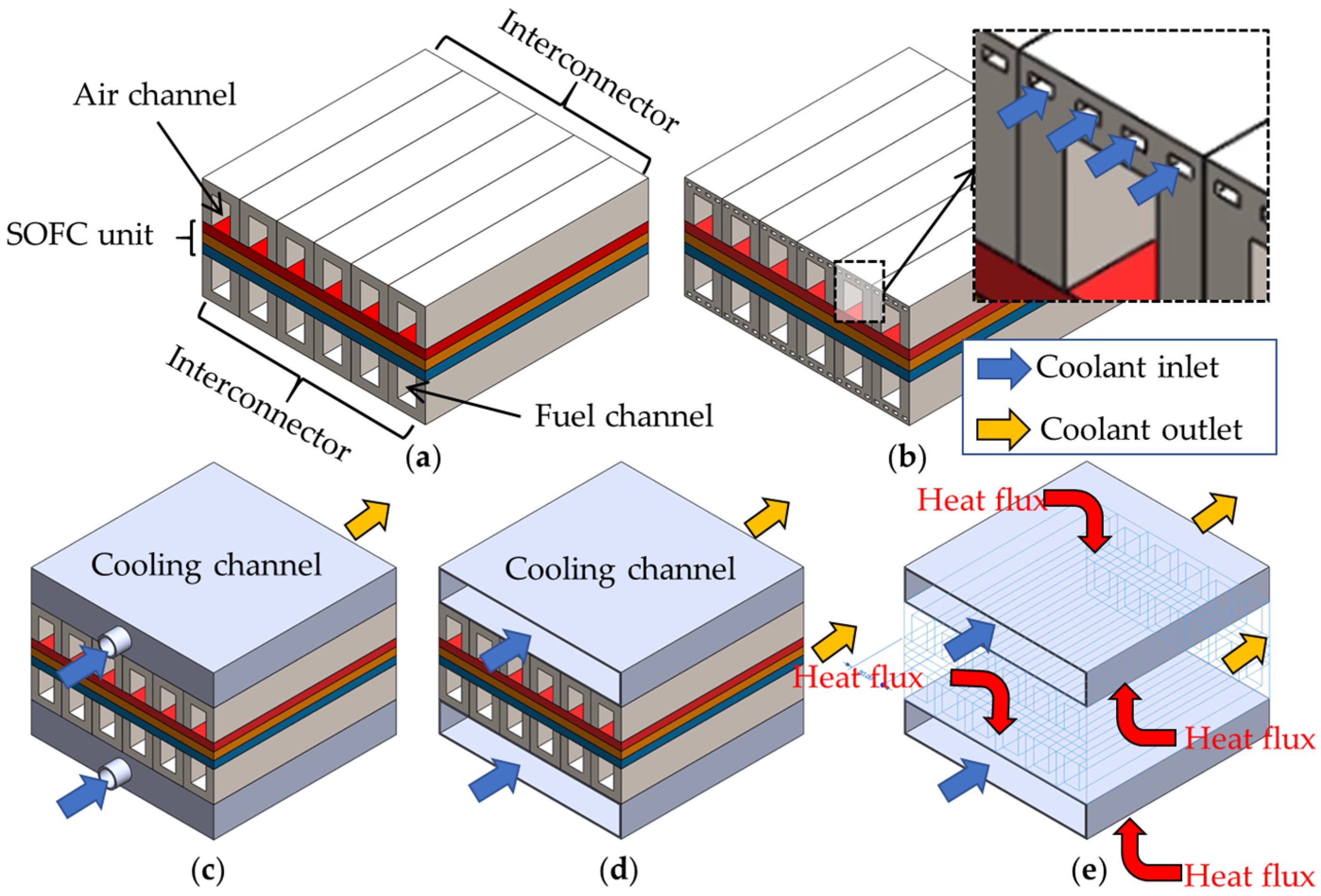 Figure 1. Different cooling strategies for SOFC stack: (a) excessive air; (b) coolant flowing through the interconnectors; (c,d) coolant passing through an additional cooling channel; and (e) concept of simplified boundary conditions in this study.