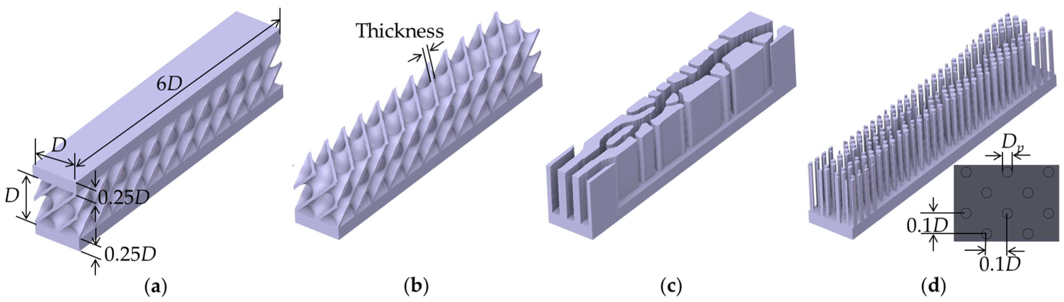 where Ain indicates the cross-sectional area at the inlet of the cooling channel, and Lp is the wetted perimeter. Using this definition, all designs are created with a consistent Dh = 20 mm. Meanwhile, the Dh values calculated using the former porous media definition are provided in the Appendix A.