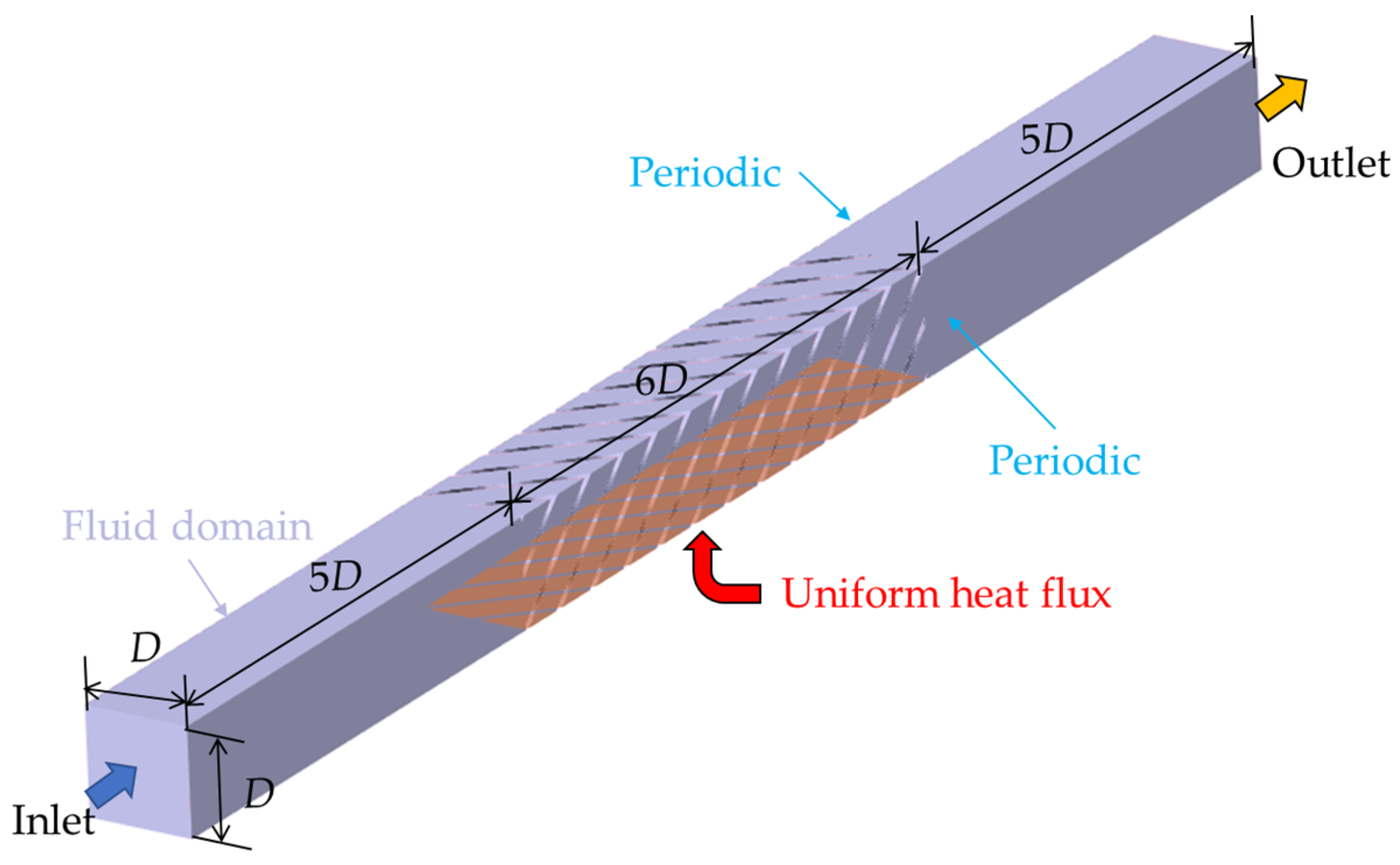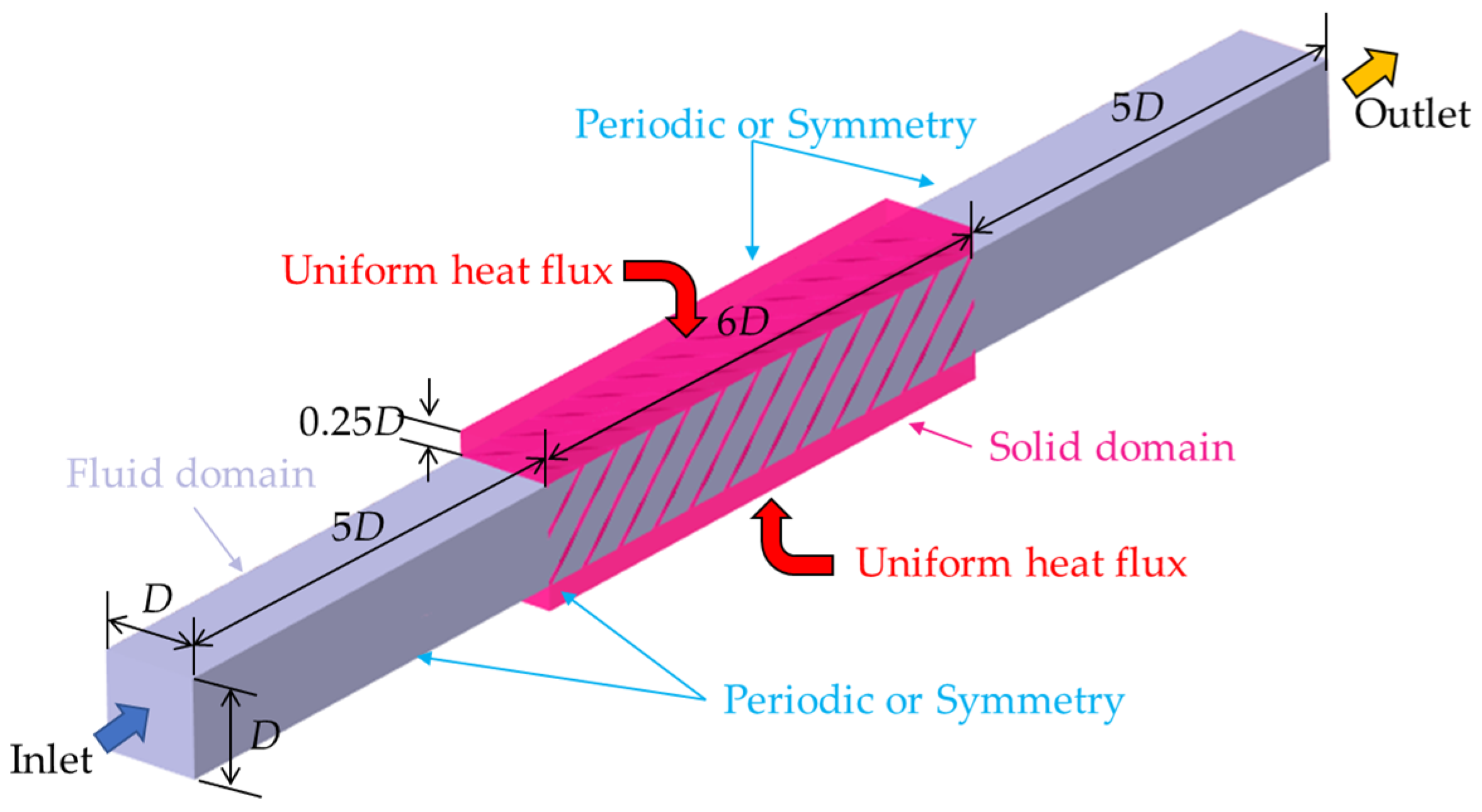 The conjugate heat transfer simulations are conducted using Ansys Fluent v. 2021R1, Ansys Inc., Canonsburg, PA, USA. Figure 3 depicts the computational domain for the cooling channel configuration. Spanwise periodic boundary conditions are applied to the Diamond TPMS model, while the symmetry conditions are used for the topology-optimized and lattice-filled models to minimize computational cost. The bottom and top walls of the solid structure are treated by a uniform heat flux of 3200 W/m2, and this value was obtained based on an operating voltage of 0.75 V by Zhang et al. [38]. The interfaces between the solid and fluid domains are modeled using conjugate boundaries, and the rest surfaces are set as adiabatic.