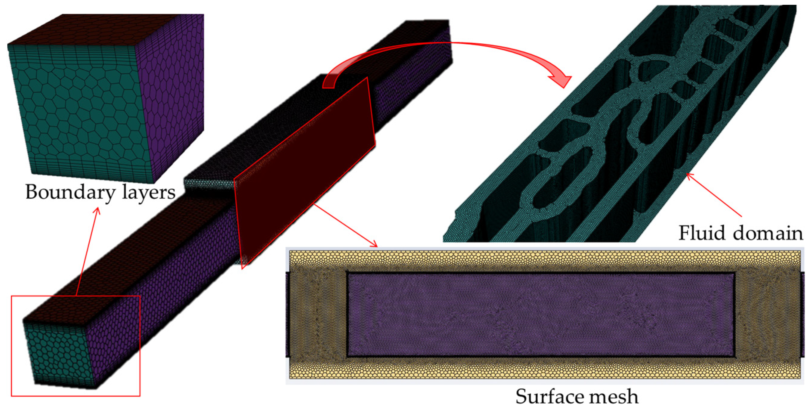 The computational domain is discretized using poly-hexcore and prism meshes generated in Fluent Meshing. Figure 4 shows the mesh system for the conventional topology-optimized design. The “Body of Influence” is activated over the cooling structure to control high-quality surface mesh. Moreover, to capture complex structures, especially the Diamond TPMS and lattice-filled models, the value of the curvature normal angle and cell per gap is set at 9 degrees and 1. The boundary layers are generated using the smooth-transition offset method with the transition ratio of 0.272. Overall, the solid and fluid domains primarily consist of hexagonal elements, while prism layers are densely generated near all no-slip walls to ensure the y+ value below 1.0.