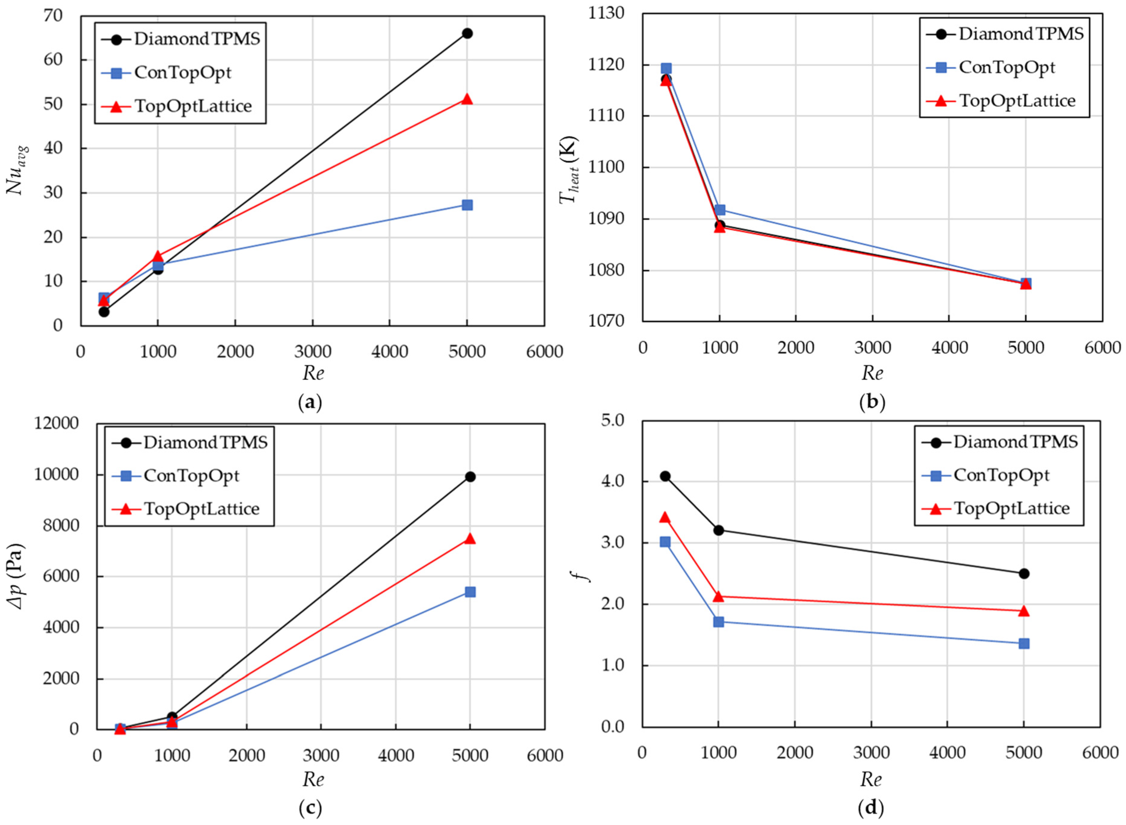 This enhanced heat removal inside the channel directly reflects the temperature removal from the heated wall in Figure 8b. All models sharply decrease wall temperatures when Re increases from 300 to 1000. At the highest coolant flow rate, the Diamond TPMS model shows the best cooling structure, followed by the topology-optimized lattice-filled model. However, the cooling performance in the Diamond TPMS structure causes the highest pressure loss and friction factor, as shown in Figure 8c,d. A direct consequence of the high pressure is that its topology blocks the flow passing through the cooling channel.