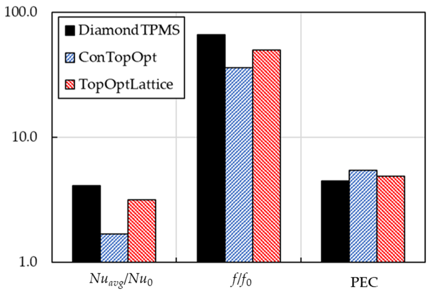 Figure 9 plots the Nu/Nu0, f/f0, and PEC of all geometries at Re = 5000 to evaluate the trade-off between heat transfer enhancement and flow resistance. The Diamond TPMS geometry yields the highest Nu/Nu0 but also incurs the largest f/f0. For all geometries, the PEC values exceed 1.0, confirming a net performance gain. Among them, the conventional topology-optimized model achieves the highest PEC of 5.48, outperforming the Diamond TPMS and lattice-filled models by 22.5% and 11.5%, respectively. This demonstrates that while the Diamond TPMS is most effective at augmenting heat transfer, the conventional topology-optimized design offers a superior overall balance by mitigating the friction penalty.
