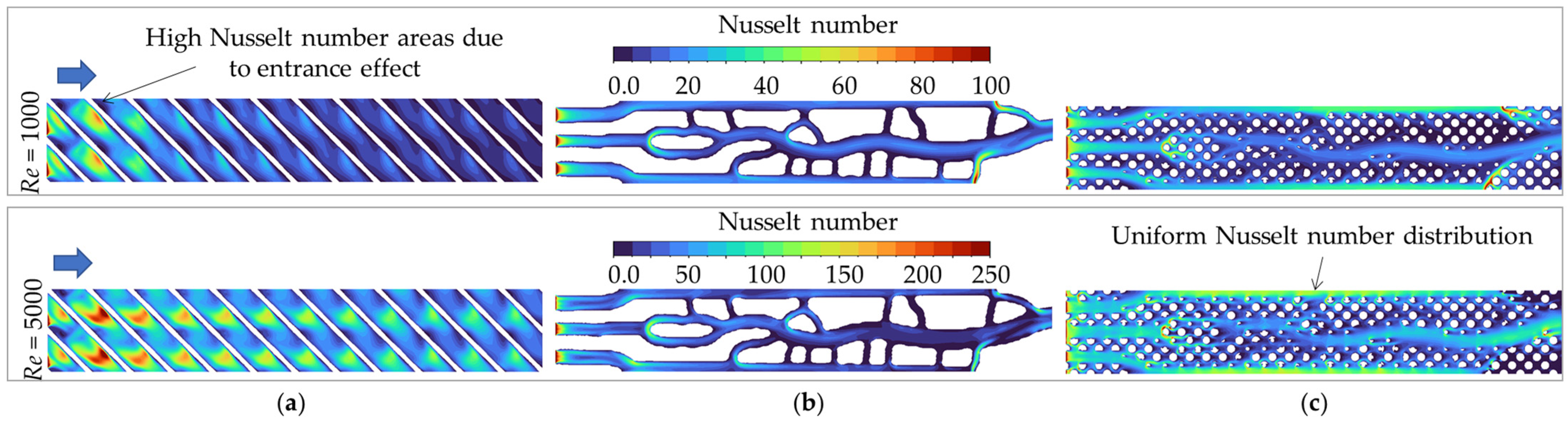 Figure 12. Nusselt number distributions on the endwall of all models at the Reynolds numbers of 1000 and 5000: (a) Diamond TPMS model. (b) Conventional topology-optimized model. (c) Topology-optimized lattice-filled model.