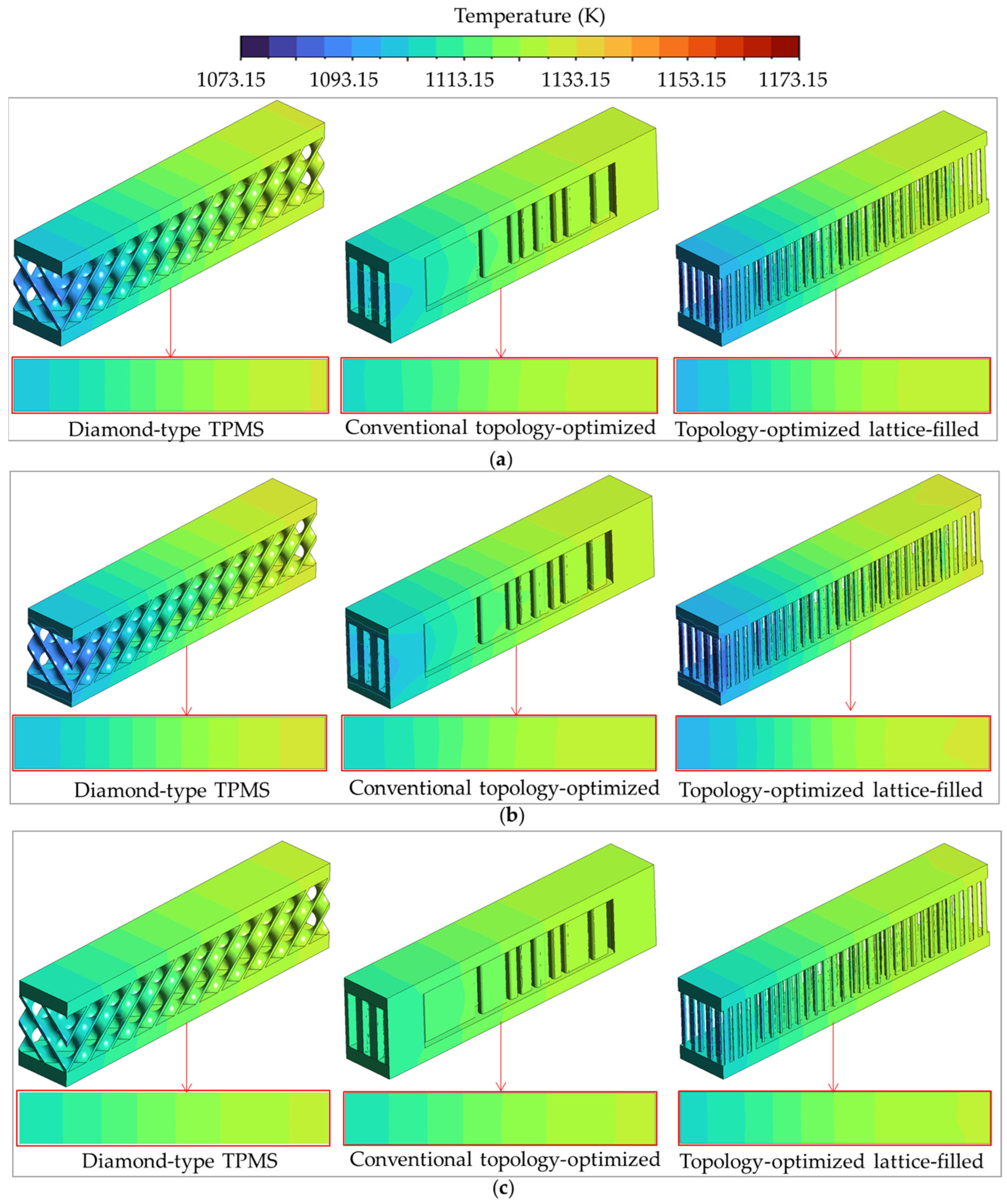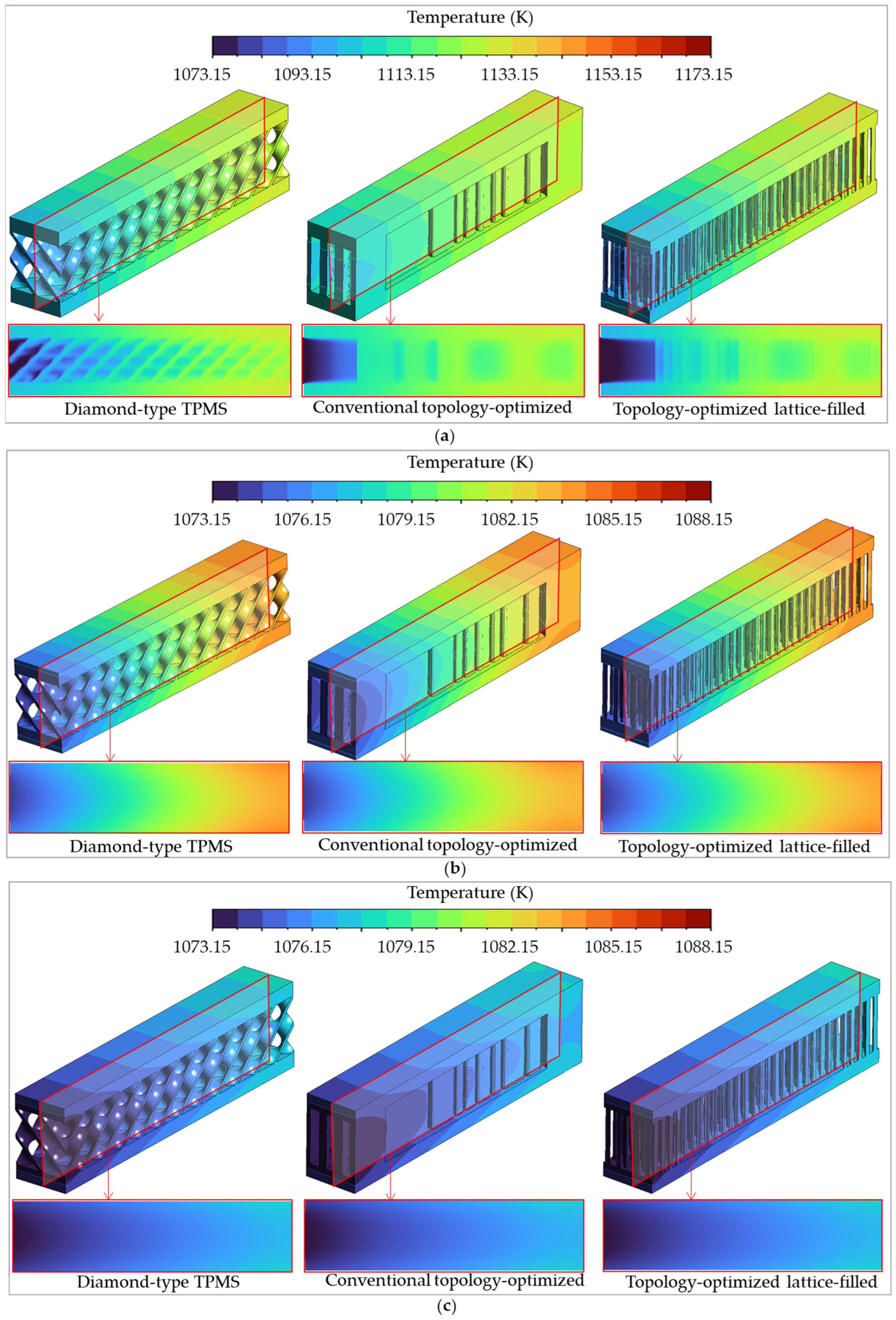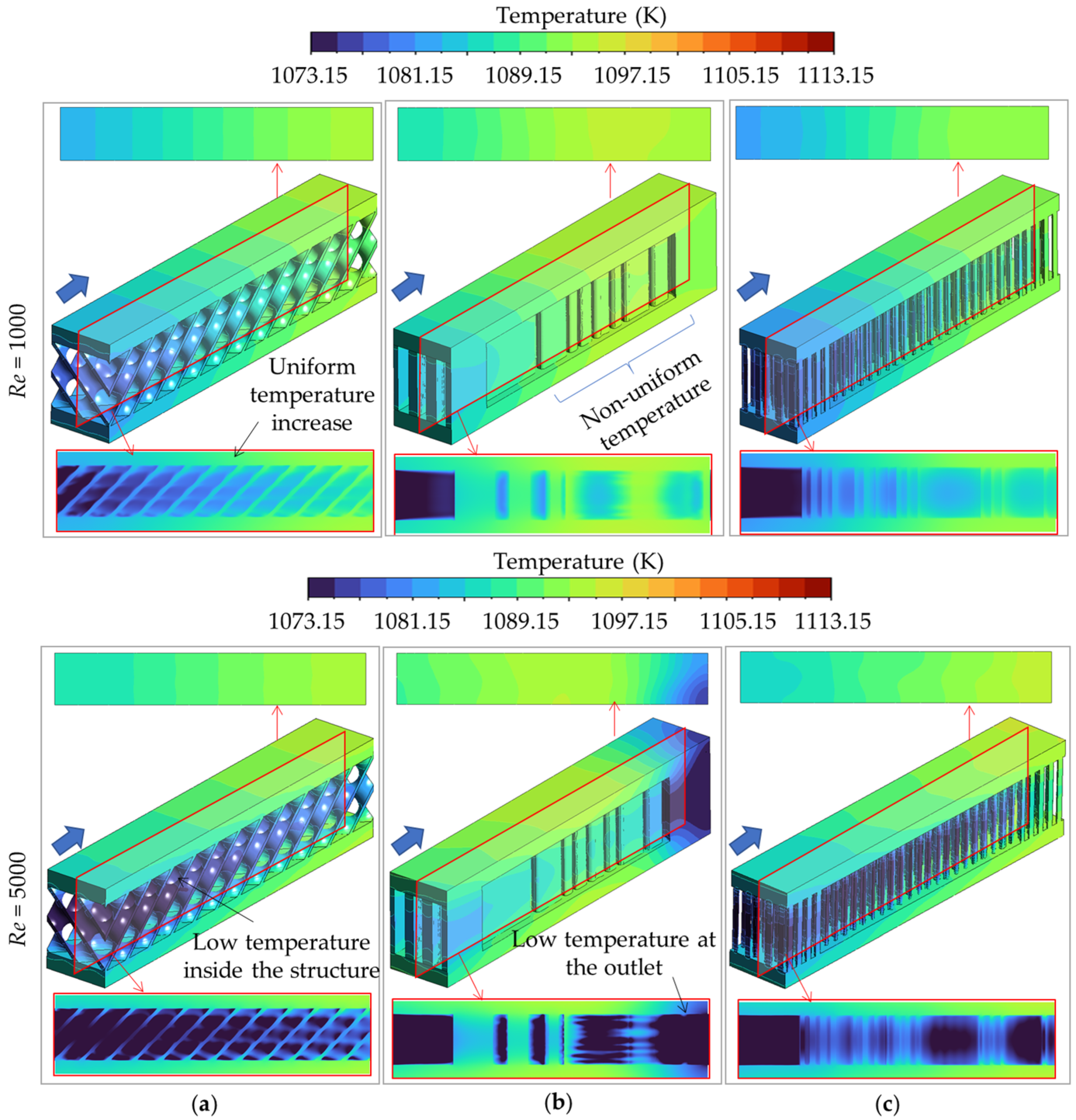 Figure 13. Temperature distributions on the solid domain of all models at the Reynolds numbers of 1000 and 5000: (a) Diamond TPMS model. (b) Conventional topology-optimized model. (c) Topology-optimized lattice-filled model.