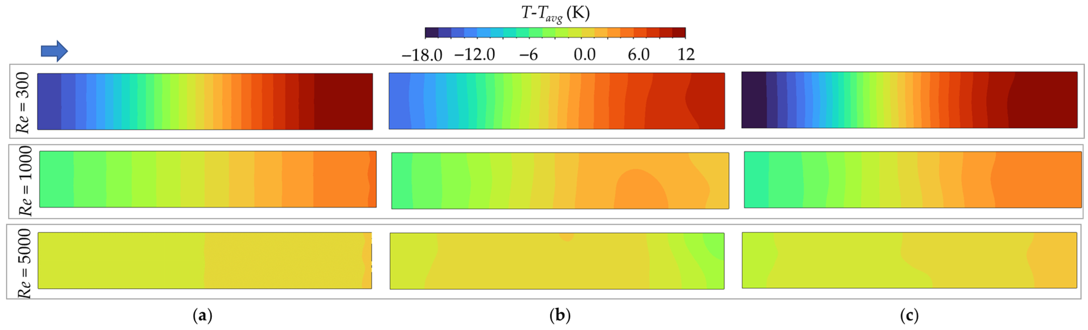 Figure 25. Contours of the temperature variation on the heated wall of all air-cooled geometries at the Reynolds numbers of 300: (a) Ferritic stainless steel. (b) Nickel–chromium superalloy. (c) High-thermal-conductivity metal.