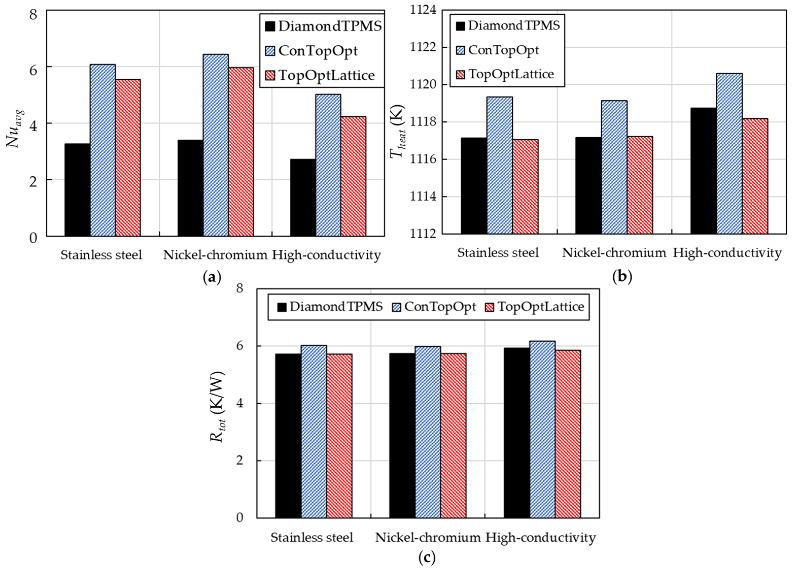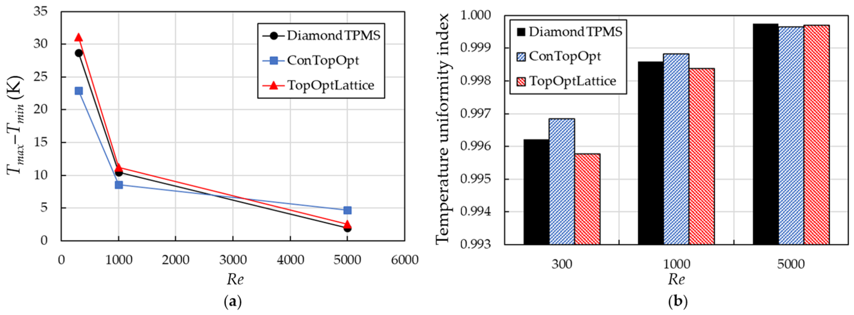 Figure 8 provides the thermo-hydraulic performance within the studied Re for the Diamond-type TPMS structure (DiamondTPMS), conventional topology-optimized structure (ConTopOpt), and topology-optimized lattice-filled structure (TopOptLattice). In Figure 8a, the area-averaged Nusselt number (Nuavg) monotonically increases as Re increases due to higher flow momentum and mixing, resulting in a thinner thermal boundary layer. All models show a competitive and steadily increasing trend at Re = 300 and 1000. The Diamond TPMS geometry, due to its intense flow accumulation [25], achieves the highest Nuavg at higher Re, followed by the topology-optimized lattice-filled model. At Re = 5000, the Nuavg value in the Diamond is 66.1, which is higher than in the conventional topology-optimized and lattice-filled models by 58.6% and 22.4%, respectively.