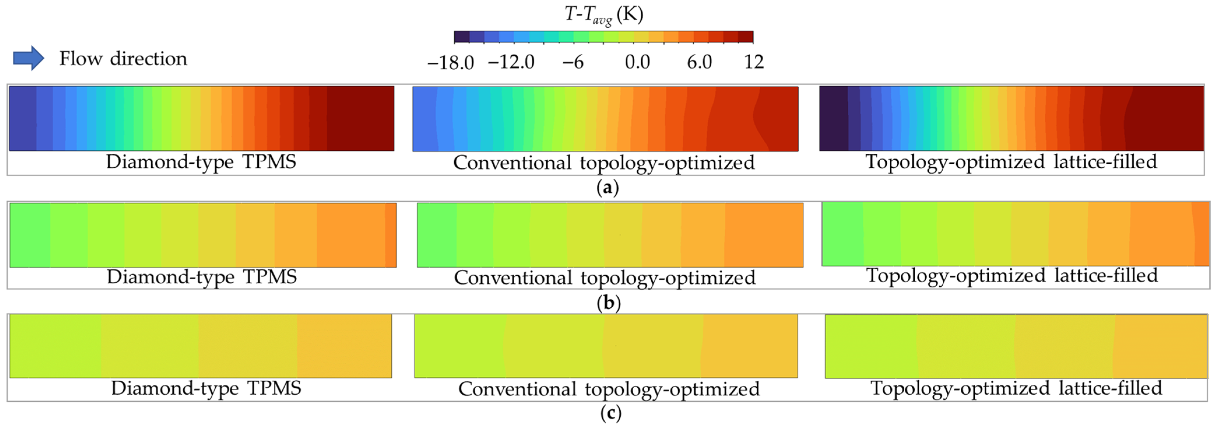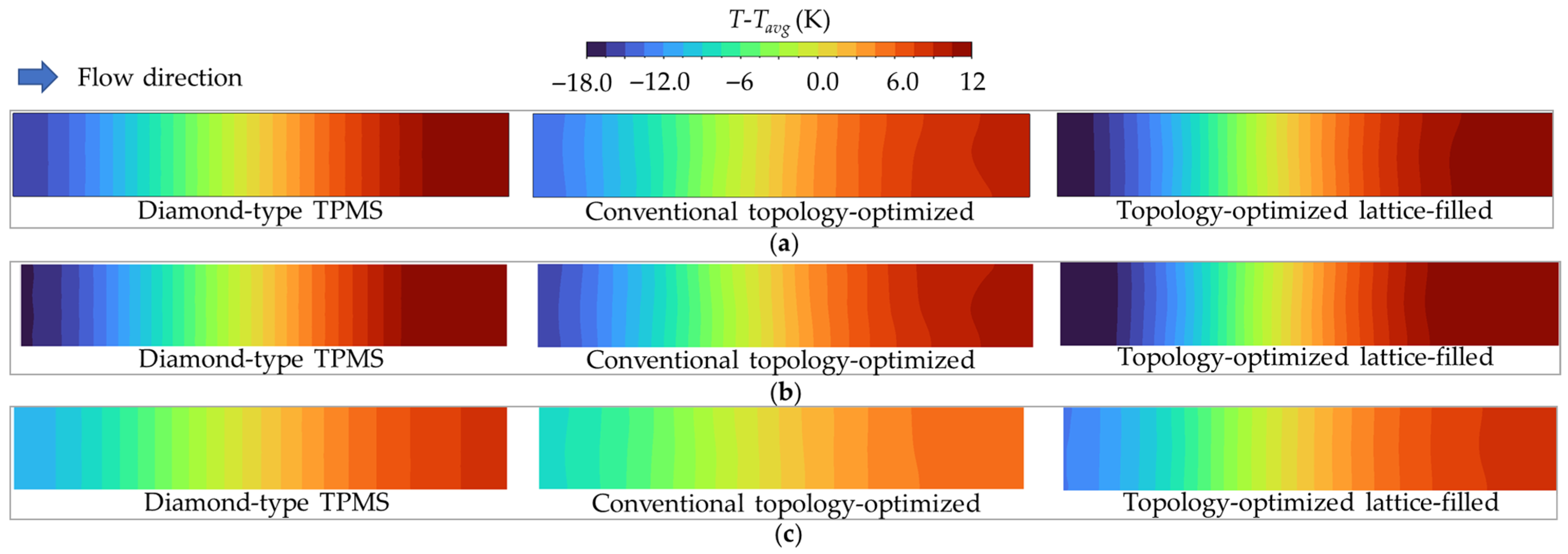In contrast, the conventional topology-optimized design in Figure 11b generates high-velocity jets between the baffles, leading to intense local heat transfer enhancement. However, this model generates strong recirculation zones at the outlet and a highly non-uniform flow distribution within the channel, particularly at Re = 5000. On the other hand, the topology-optimized lattice-filled structure in Figure 11c emerges as a hybrid solution. Although its flow distribution is not perfectly uniform as in the Diamond TPMS model, the integrated lattice structures with large surface areas induce local turbulence and mixing, enhancing overall cooling uniformity more effectively than the conventional topology-optimized model.