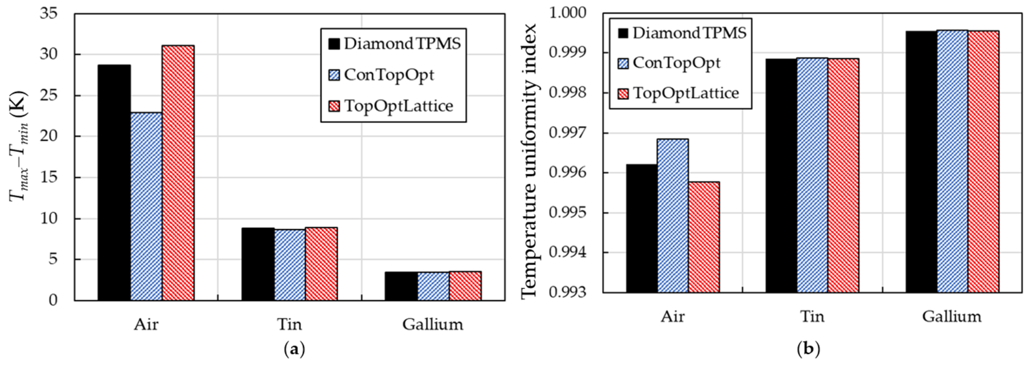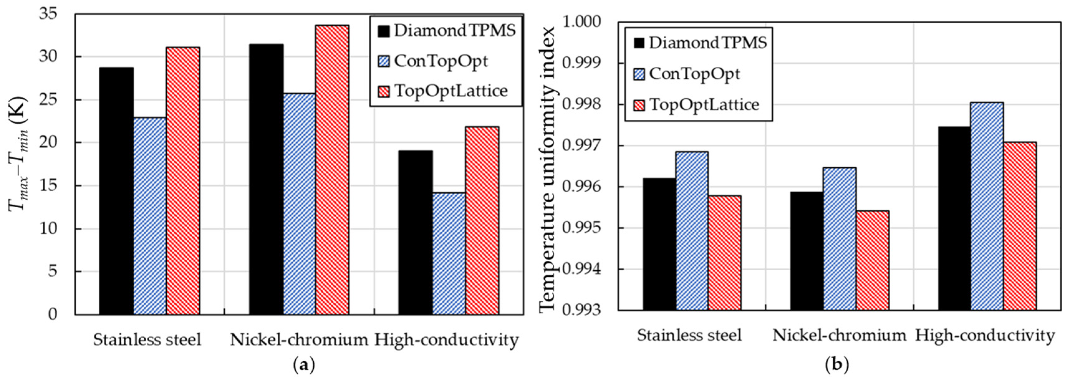 Figure 26. Evaluation of temperature uniformity on the bottom heated wall of all air-cooled geometries with different structural materials at the Reynolds numbers of 300: (a) Tmax–Tmin and (b) temperature uniformity index.