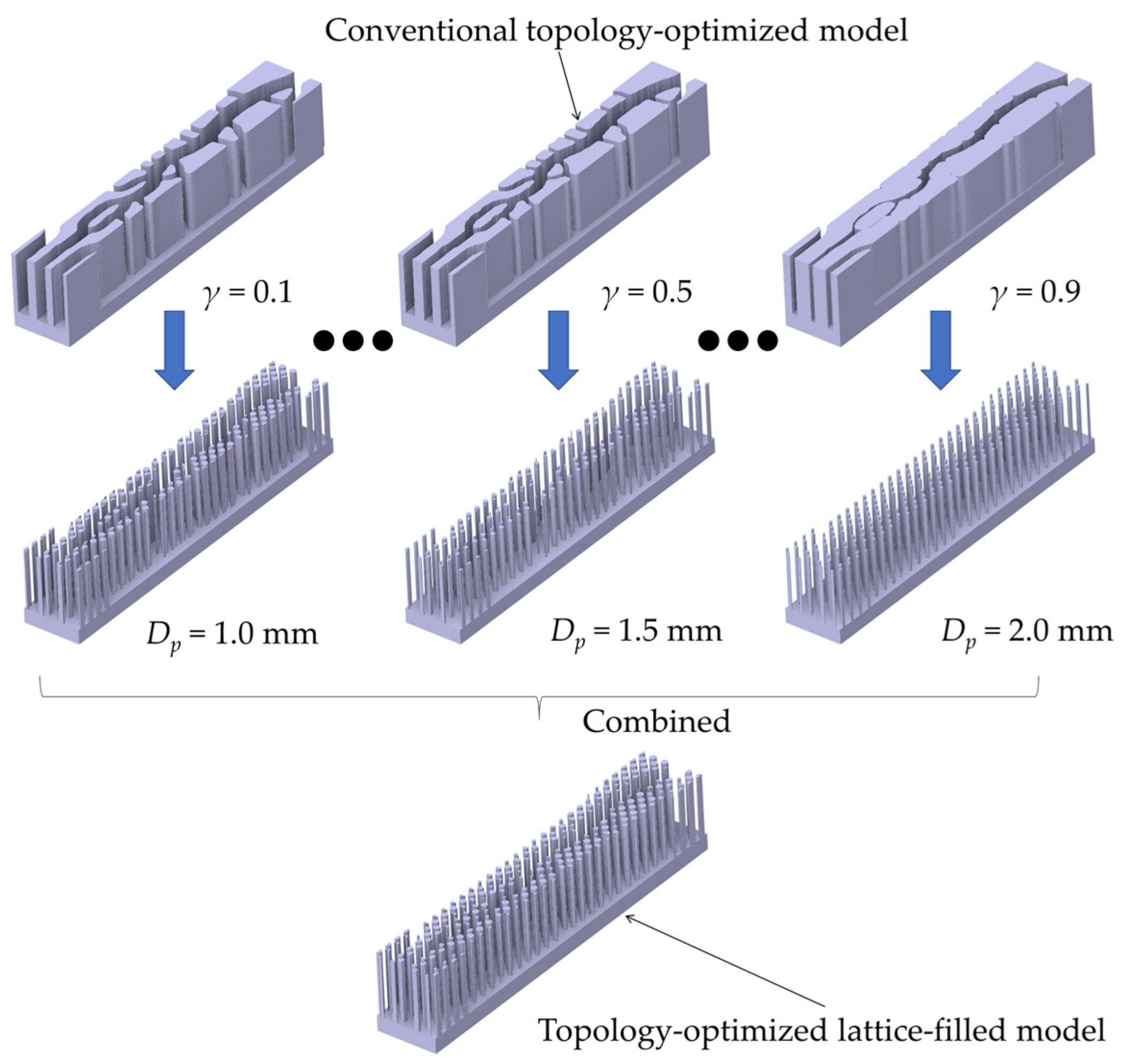 Topology-optimized lattice-filledArrays of circular pin-fin structures with a Dp of 2 mm are filled in the density field of 0.1, and the Dp decreases consistently to 0.5 mm in the density field of 0.9.28,958.980