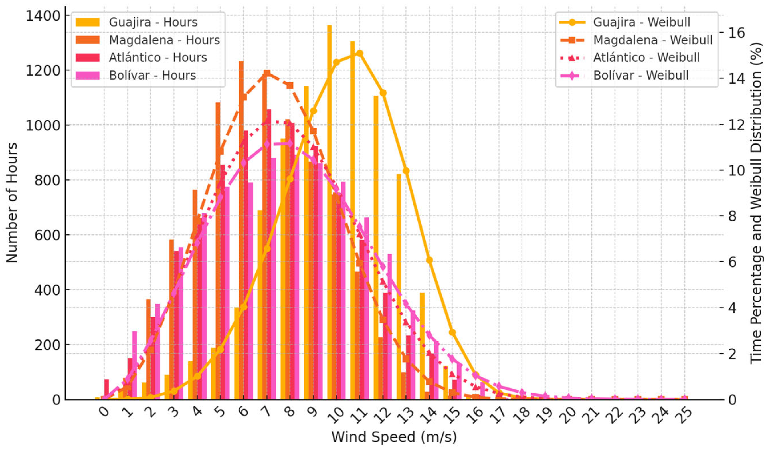 3.3. Wind Speed Distribution Analysis and Weibull Characterization