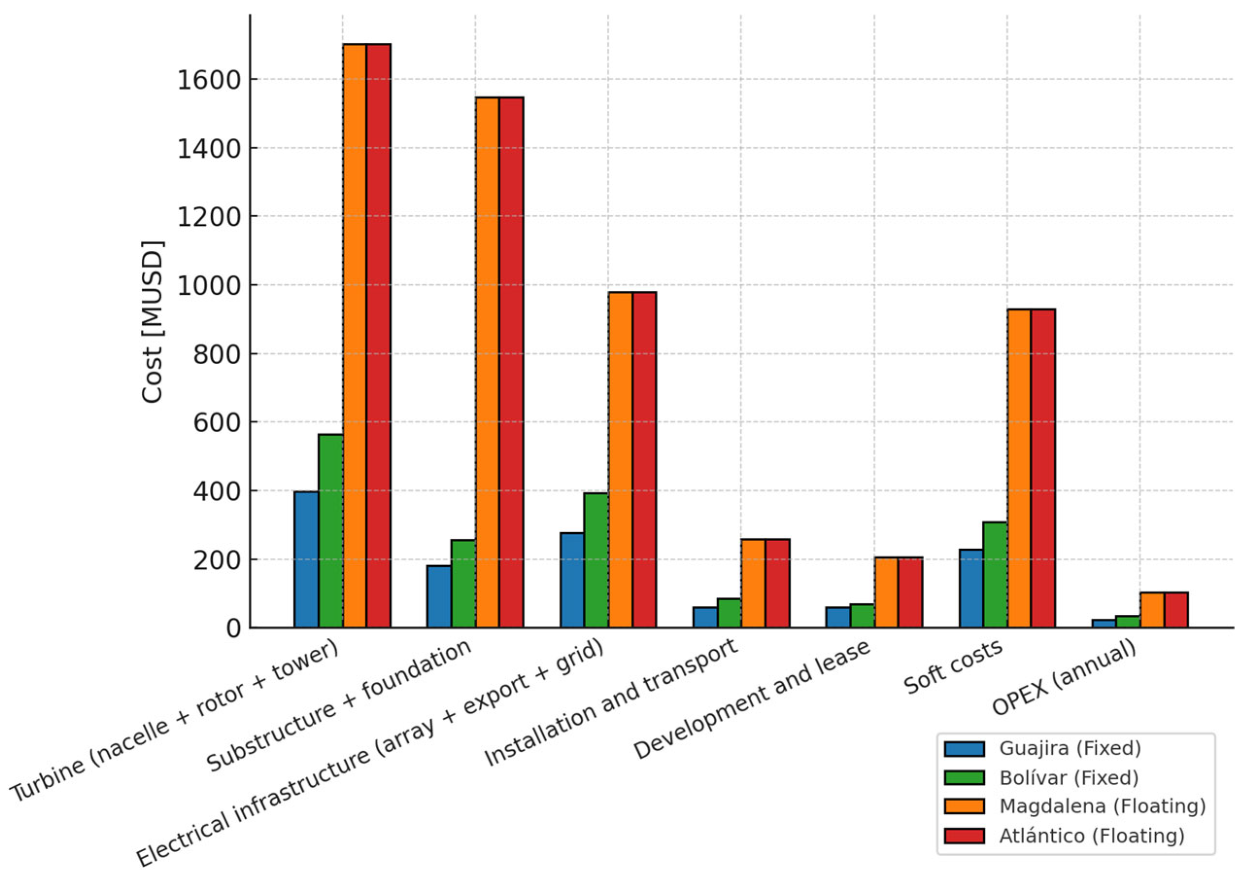 | Component | Cost Share [%] (Fixed/Floating) | La Guajira (Fixed) | Bolívar (Fixed) | Magdalena (Floating) | Atlántico (Floating) |