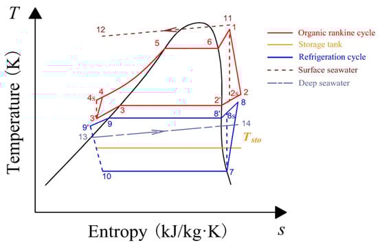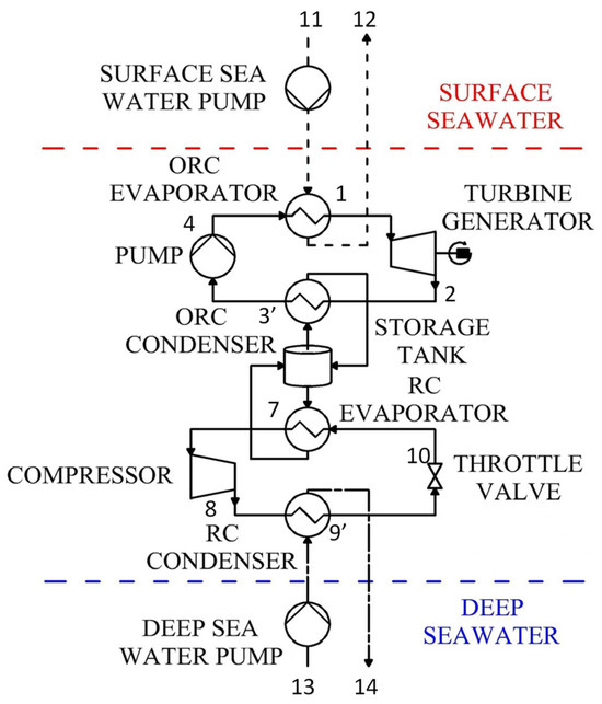 Surplus electricity is used to drive the RC compressor during the charging cycle. This compression act increases the temperature and pressure of the working fluid exiting the RC evaporator. The working fluid then enters the RC condenser, where it exchanges heat with deep seawater to reach a sub-cooled state. Subsequently, it passes through the throttle valve for expansion before entering the RC evaporator. Through a water–glycol loop, the cooling energy generated by the RC is stored in the storage tank. As shown in Figure 2, the charging cycle (RC) follows the sequence 7–8–9′–10–7, converting surplus electricity into cooling energy that is stored in the storage tank. Meanwhile, during peak grid periods, the ORC working fluid is heated by warm surface seawater in the evaporator, generating superheated vapor. This vapor consequently expands through the turbine, performing mechanical work that drives a generator to produce electricity. The low-pressure working fluid from the expander outlet next enters the condenser. There, it is cooled by a water–glycol loop that transfers heat to the storage tank, condensing the fluid into a subcooled liquid. Accordingly, the discharging cycle follows the sequence 1–2–3’–4–5–6–1 in the T-s diagram.