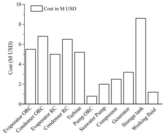 The total system cost from an engineering standpoint breaks down into initial investment and operational and maintenance costs. The initial investment cost for each component is derived from empirical formulas listed in Table 2. The costs of the water and throttle valve are excluded from this analysis due to their significantly lower values compared to other components [36,37].
