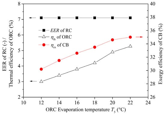 In addition to the RC evaporation temperature, another parameter that significantly affects system performance is the evaporation temperature of ORC sub-cycle, which is closely restricted by the surface seawater temperature. Figure 7 shows the relationship between ORC evaporation temperature and system thermodynamic performance. As shown in Figure 7, with the increase in ORC evaporation temperature, the thermal efficiency of ORC sub-cycle (ηth) and the exergy efficiency of CB system (ηex) are gradually rising, while the EER of RC remains unchanged. Specifically, as the ORC evaporation temperature is raised from 12 °C to 22 °C, the relative increase in ORC thermal efficiency is more than 75% and in exergy efficiency of the entire system is nearly 16%.