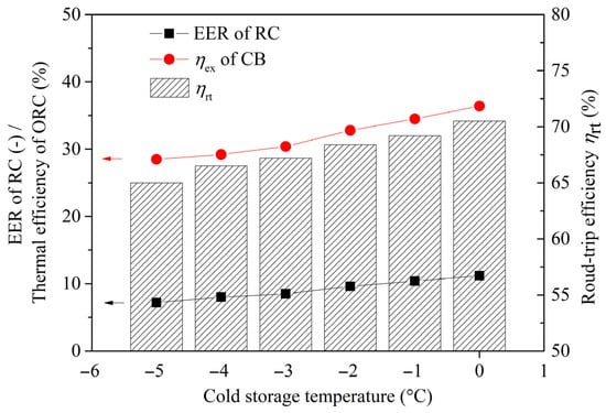 The cold storage temperature is a critical parameter for the performance of both the RC sub-cycle’s EER and the overall CB system. Figure 9 investigates the effect of cold storage temperature (from −5 °C to 0 °C) on system performance. As shown in Figure 9, increasing the cold storage temperature leads to a decrease in the EER of the RC sub-cycle. This occurs because a higher cold storage temperature reduces the heat transfer temperature difference in the RC evaporator, which in turn increases the EER and exergy efficiency of the CB system. It is found that an increase in the cold storage temperature from −5 °C to 0 °C results in respective rises of 56% in the RC subsystem’s EER and 28% in the total CB system’s exergy efficiency. The round-trip efficiency increases from 65.0% to 70.5%. Variations in the cold storage temperature, however, leave the thermal efficiency of the ORC sub-cycle virtually unchanged.
