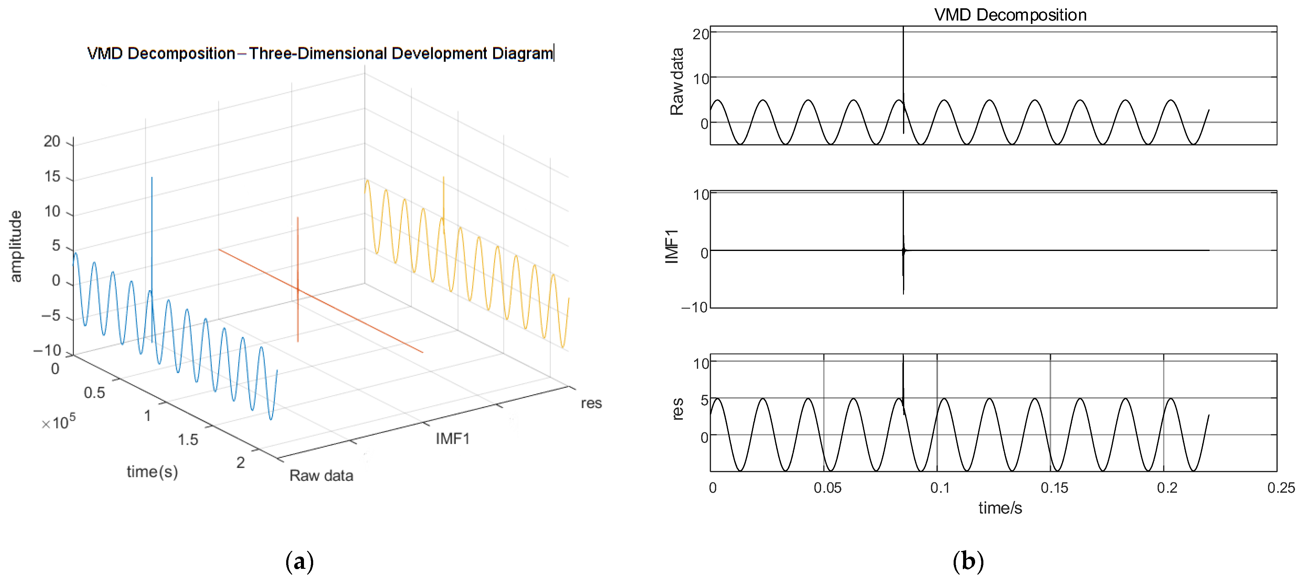 Figure 1a, the three-dimensional plot illustrates the amplitude distribution of the decomposed signal components over time. The VMD separates the original waveform into several intrinsic mode functions (IMFs) and a residual term, each corresponding to specific frequency characteristics. As shown in