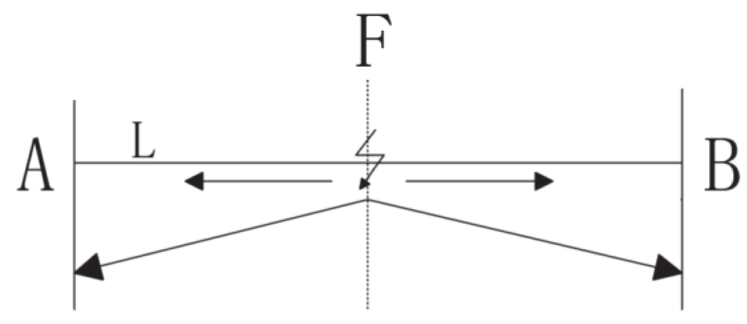 Figure 2 illustrates the principle diagram of the double-ended traveling wave fault location method. Points A and B represent the two ends of the line, where the measuring units are installed. F denotes the fault location, and L is the length of the power distribution line. When a fault occurs at point F, a fault traveling wave is generated at the fault point F and propagates along the line toward points A and B. Let