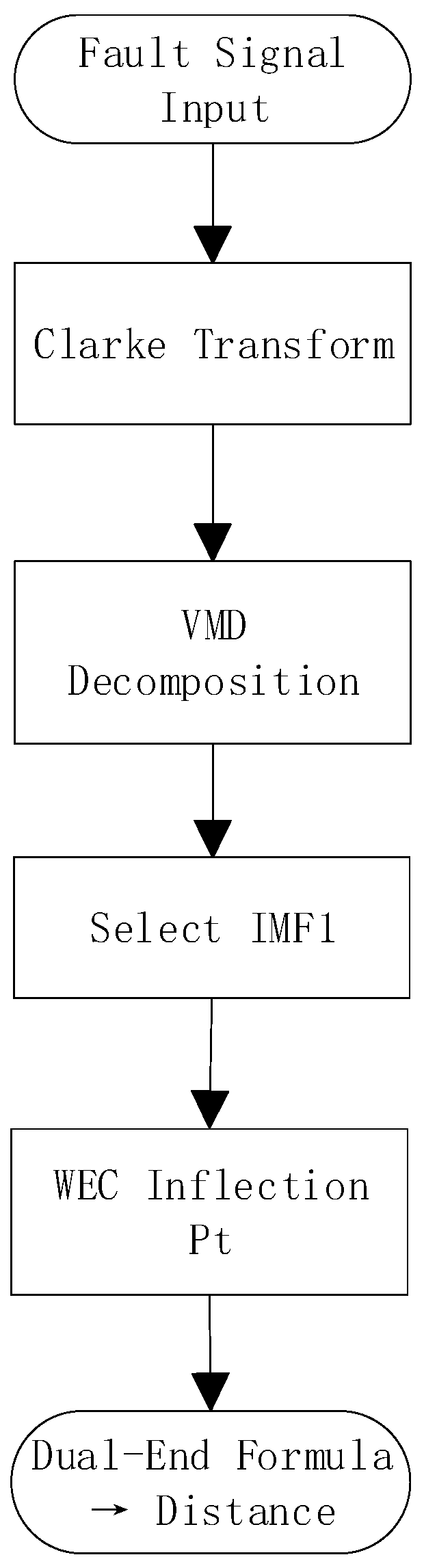 To address these issues, a dual-terminal distance measurement method based on wave body energy localization is proposed. This approach calculates the cumulative energy of the entire traveling wave and identifies the point where cumulative energy reaches its maximum as the wave’s arrival time at the measurement terminal. This yields the time difference between the two terminals, replacing the wavefront time difference used in traditional localization methods. Unlike traditional positioning methods that rely on calibrated wavefront algorithms, wave body energy positioning fully leverages the stable overall characteristics of traveling wave signals. The process flow of the traveling wave distance measurement method for distribution network lines proposed in this paper is shown in