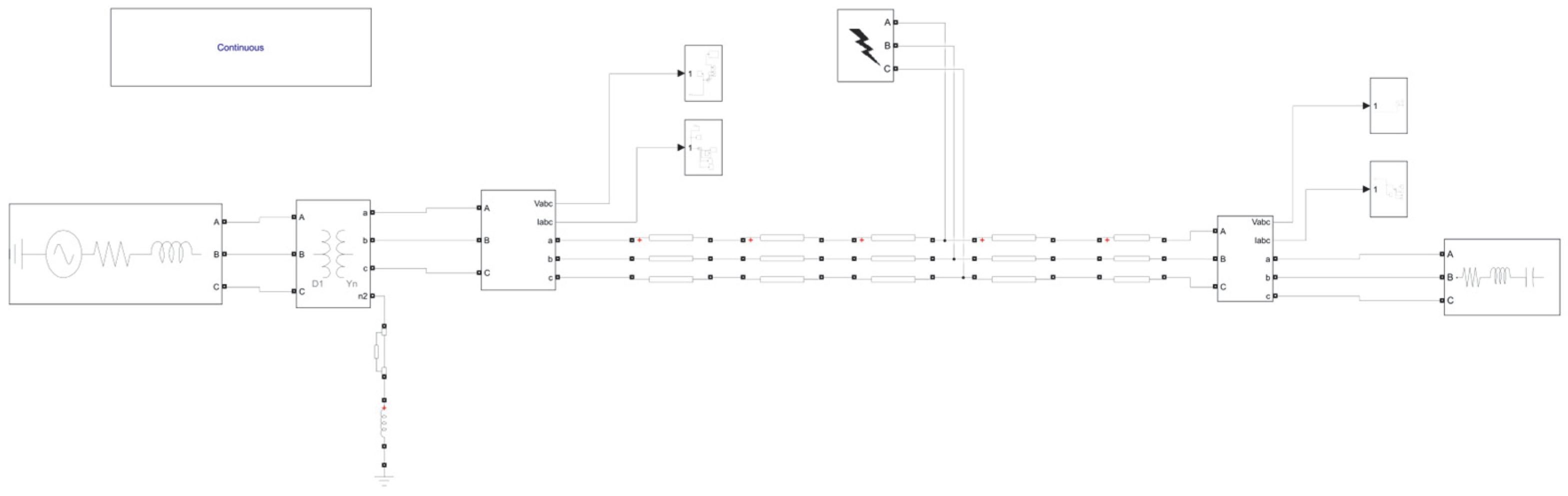 Figure 4. The simulation was set to start at 0 s, run for 0.22 s, with a sampling frequency of 1 MHz and a fault duration of 0.003 s. Distribution line distributed parameters are shown in