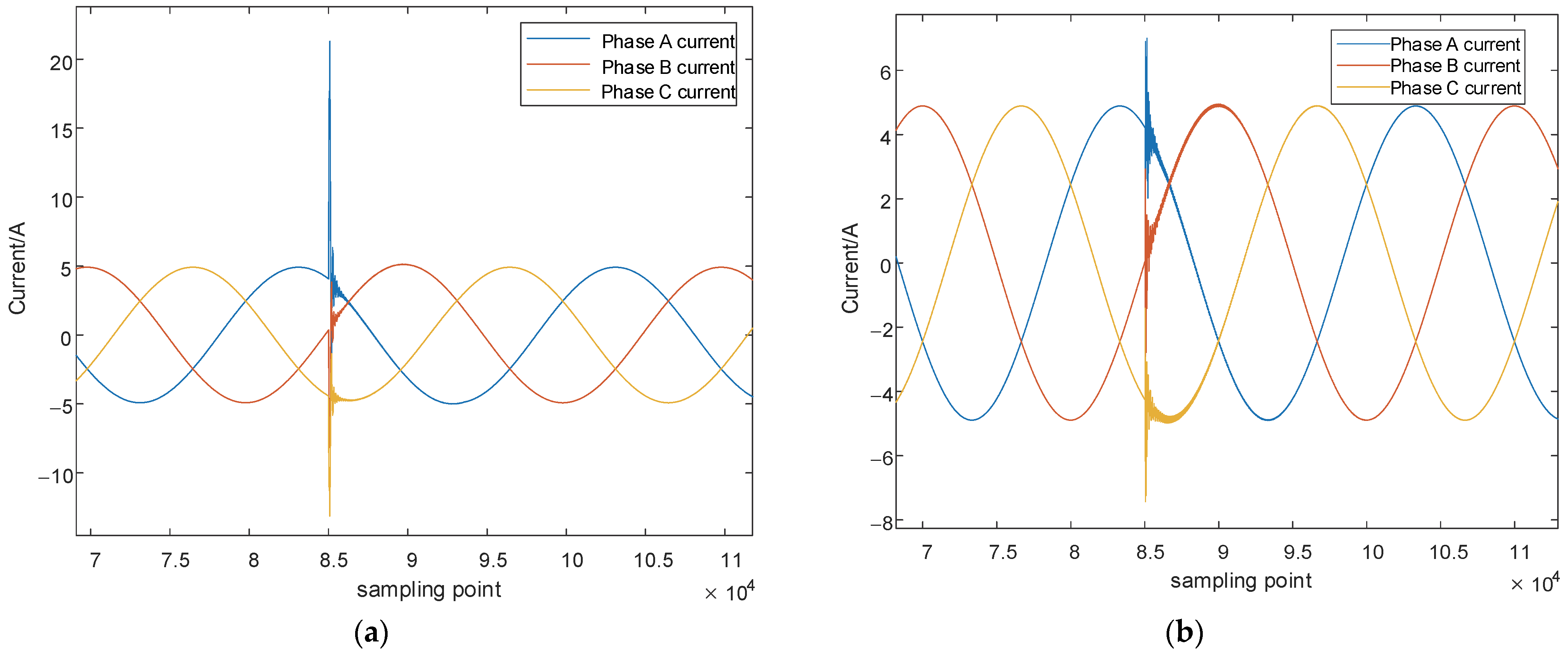 Figure 5 shows the three-phase current waveforms at both terminals when a ground fault occurs on Phase A.