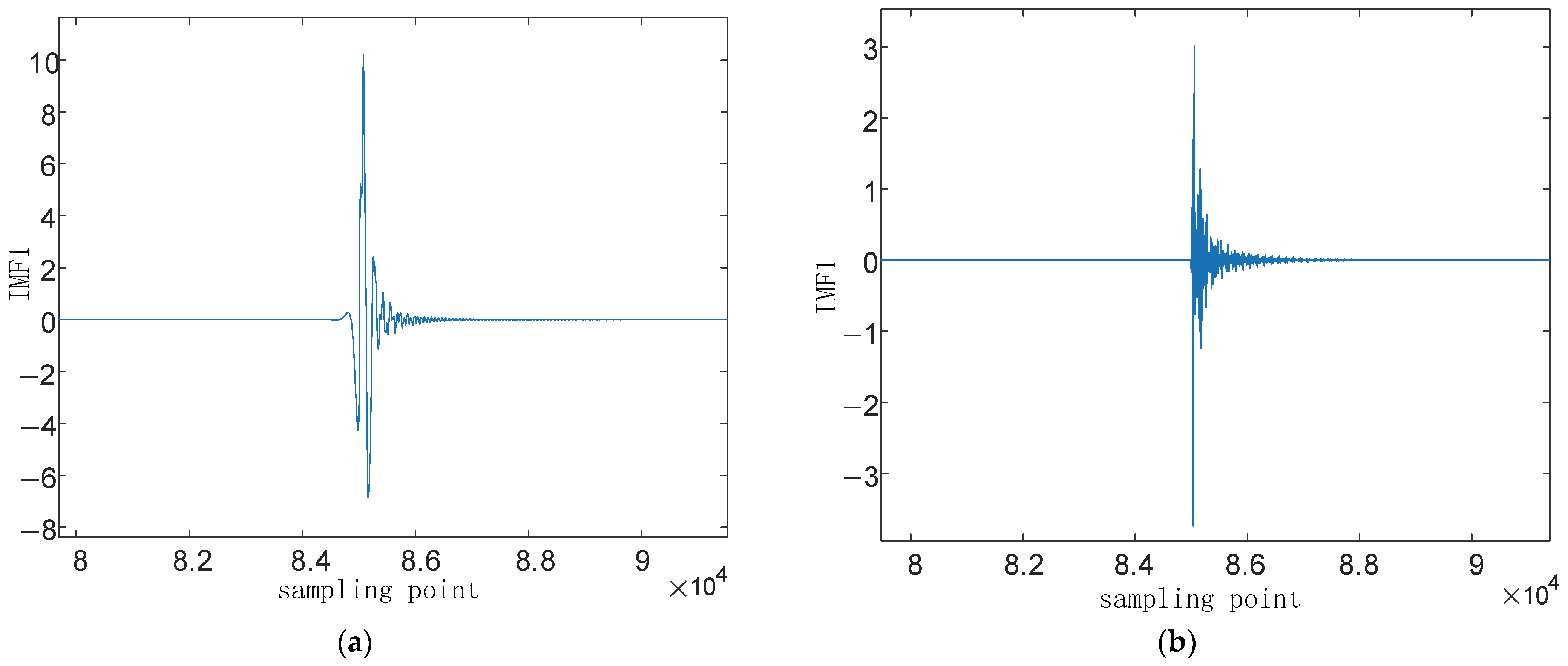 First, the low-frequency components of the line-mode current signals at both ends were removed using VMD, yielding the IMF1 component results shown in