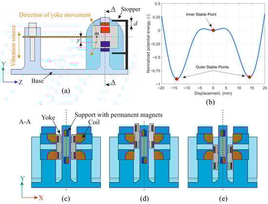 CAD diagram of the nonlinear tristable vibration energy harvester (a), Potential energy landscape of the vibration energy harvester (b), Yoke resting in the inner stable point (c), Yoke resting in the upper stable point (d), Yoke resting in the lower stable point (e).