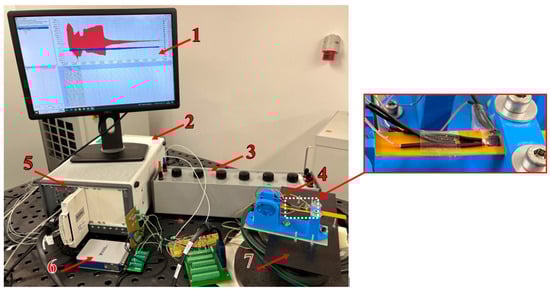 Desktop (1), PXIe-8861 embedded controller housed in a PXIe-1092 chassis (2), Resistance decade box (3), Nonlinear electromagnetic vibration energy harvester whose beam was instrumented with TF-3-2x/120-type strain gauges (4), PXIe-6368 multifunction data acquisition (DAQ) module (5), PXI-9237 strain/bridge input module (6), Vibration source (7).