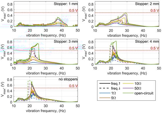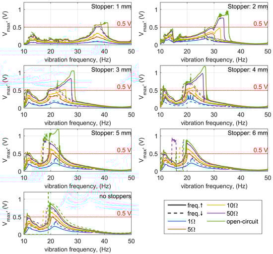 The parallel plot (Figure 7) shows that the widest bandwidth, equal to 7.5 Hz, occurs during the increasing frequency sweep for a stopper distance of 3 mm and a load resistance of 50 Ω. For the decreasing frequency sweep, the best configuration yields a bandwidth of 7 Hz at a stopper distance of 6 mm and load resistance of 50 Ω. At higher excitation levels, it can also be observed that the characteristics corresponding to lower load resistances (from 5 Ω) may exceed the 0.5 V threshold.