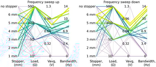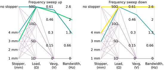 To analyze parameters such as the bandwidth and the average voltage amplitude within that range, a parallel plot was created (Figure 5). This plot shows that, during increasing vibration frequency, the widest bandwidth is achieved for a stopper distance of 3 mm and a load resistance of 50 Ω, amounting to 2 Hz. Under the same configuration but for decreasing frequency, the bandwidth equals approximately 1.2 Hz. The average voltage amplitudes within these bands are 0.54 V and 0.5 V, respectively. The widest bandwidth for decreasing frequency, equal to 2.6 Hz, is obtained for a 4 mm stopper distance and a 50 Ω resistance.