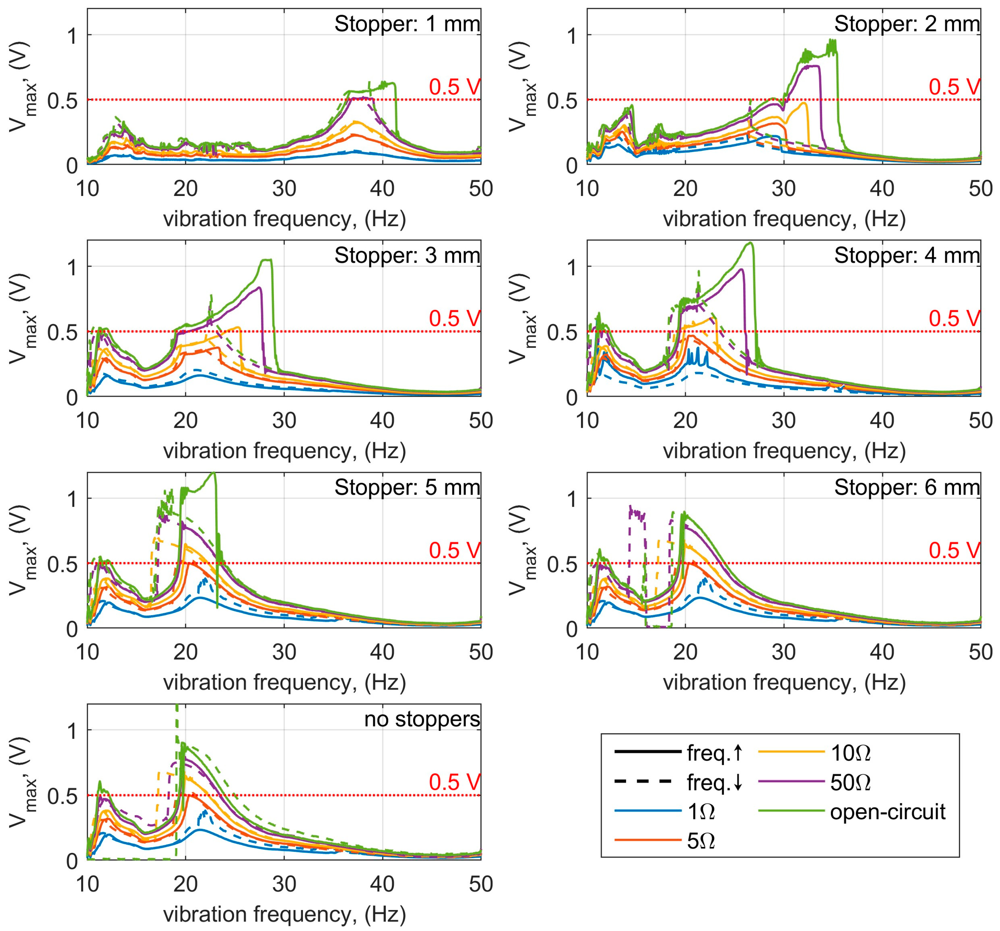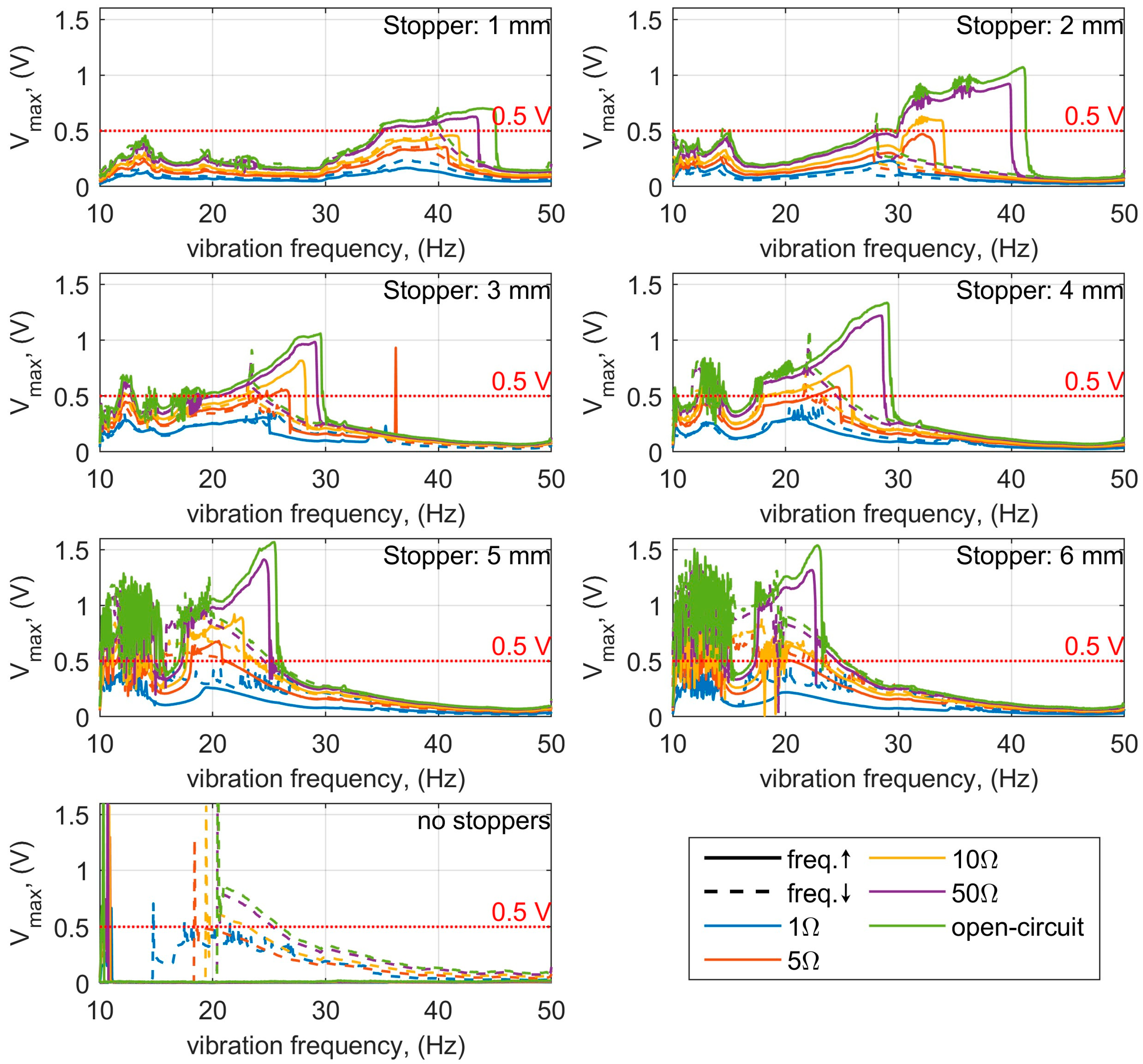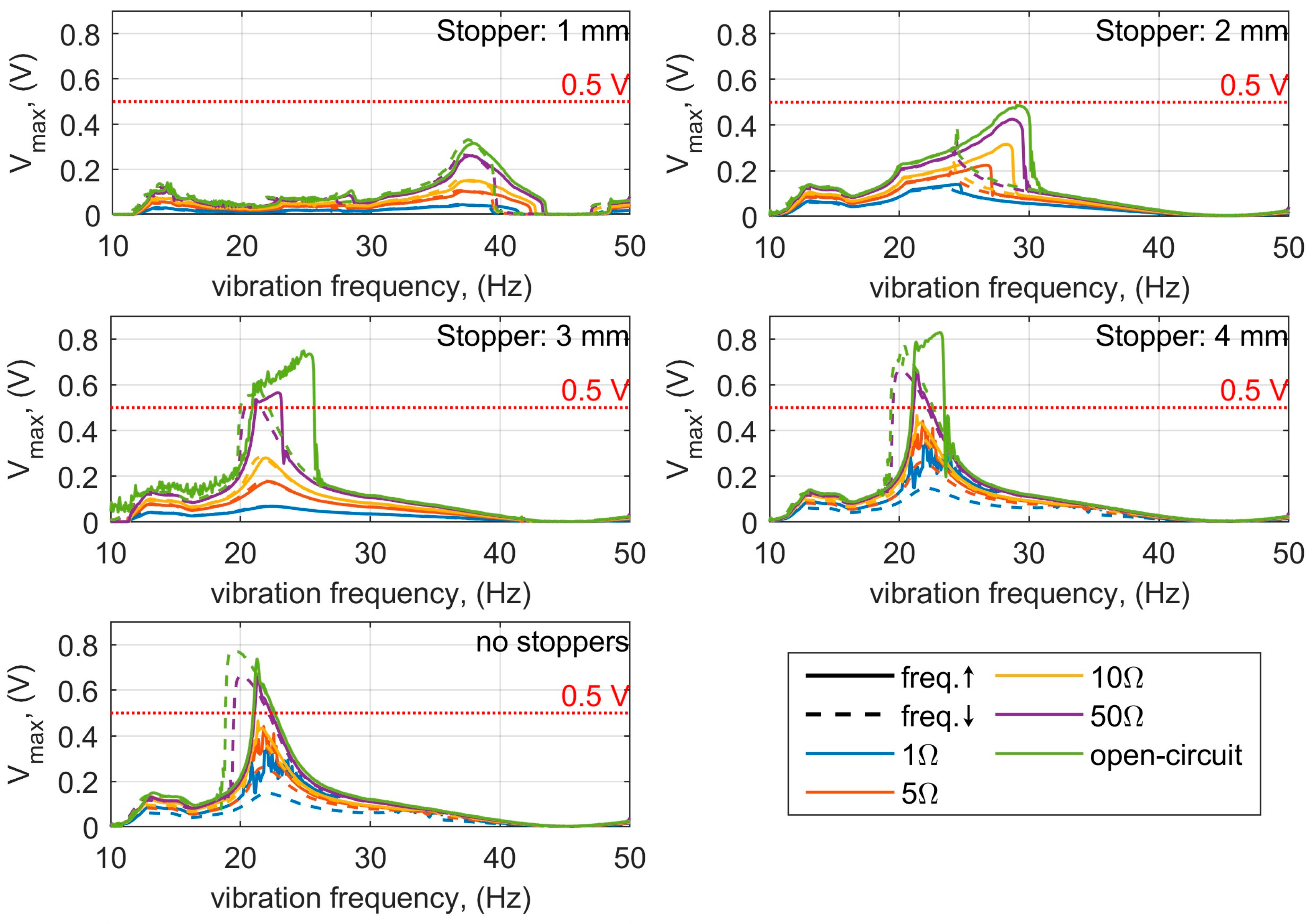 - Influence of stoppers on system performance:The implementation of adjustable stoppers has a direct and measurable impact on the output parameters of the harvester. By appropriately setting the stopper distance, it is possible to effectively tune both the bandwidth and the average output voltage, enabling flexible adaptation of the harvester to environments with variable excitation frequencies.