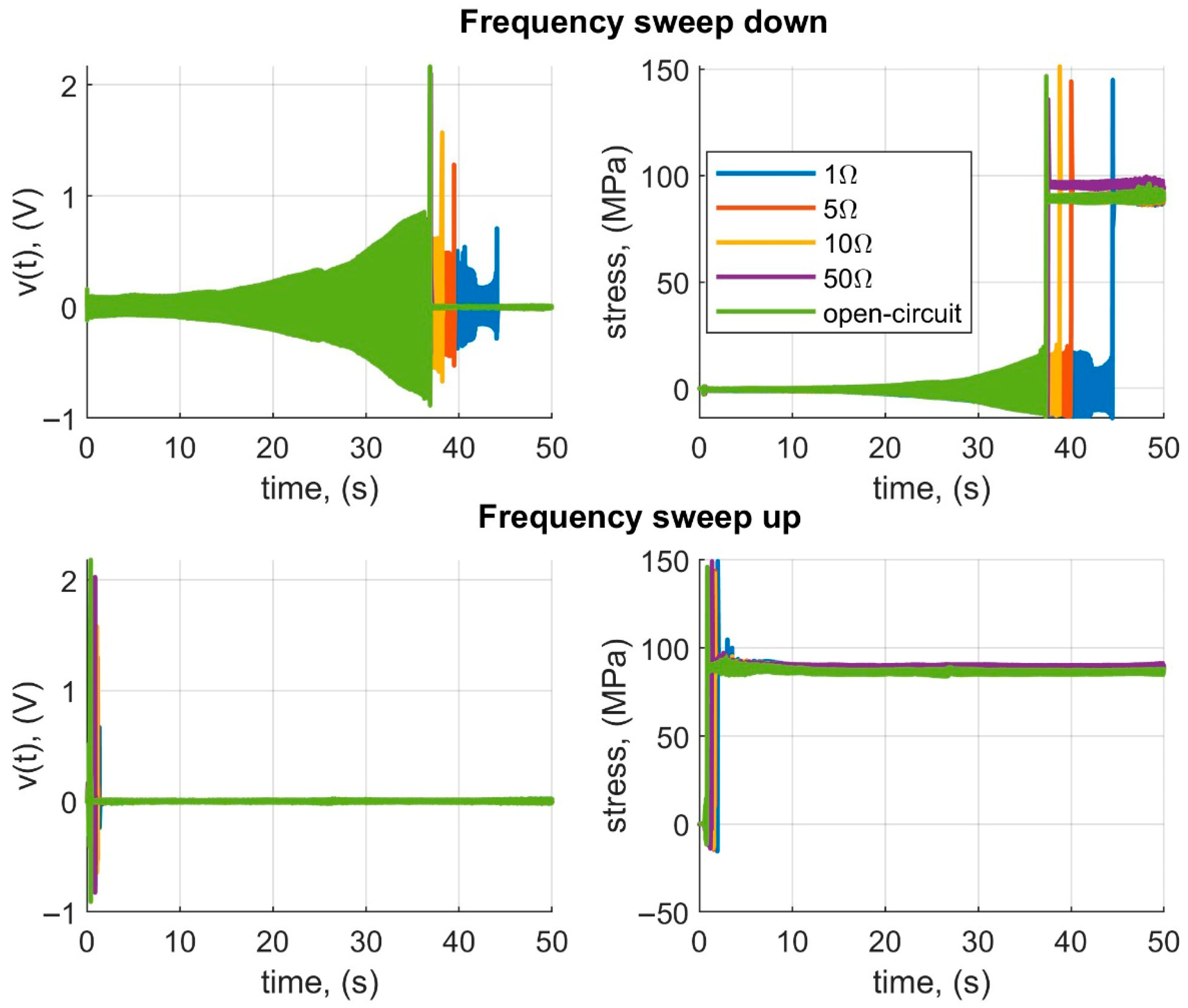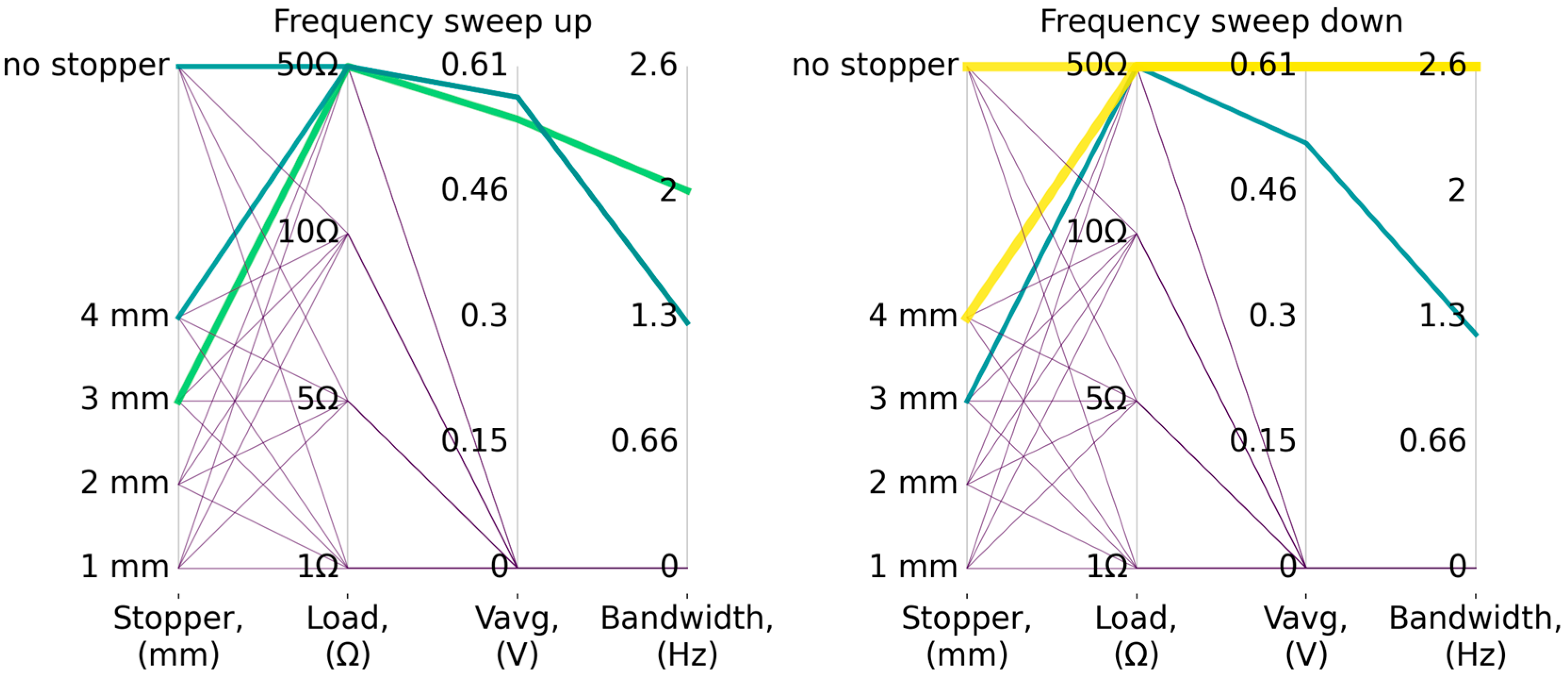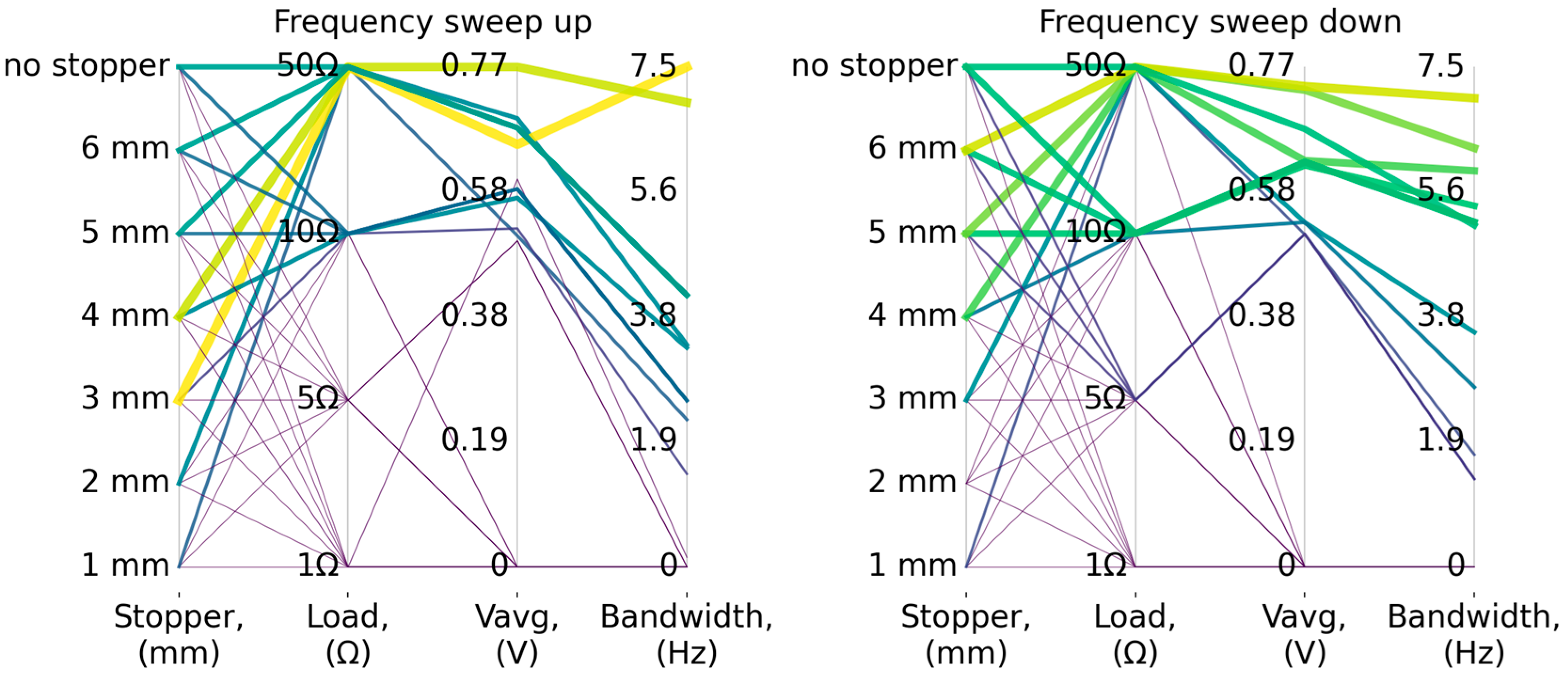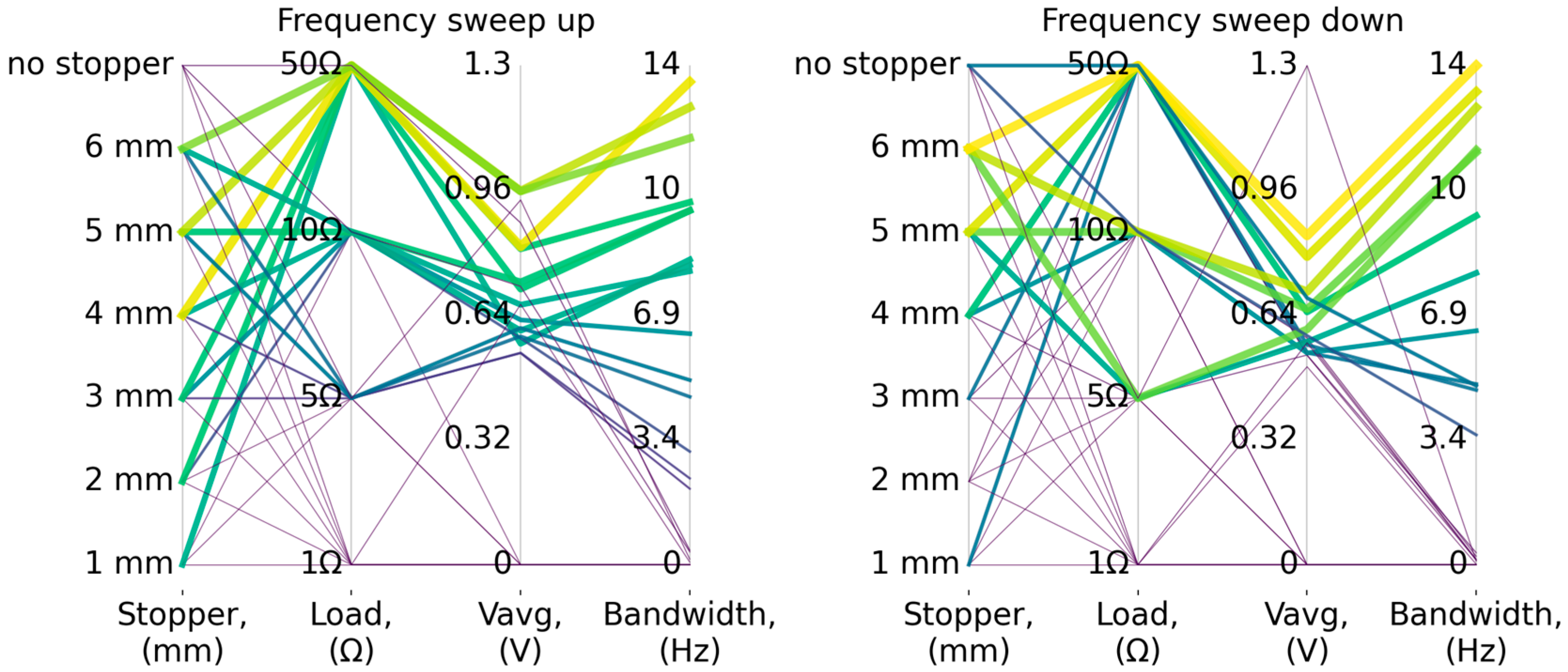 - Influence of stoppers on system performance:The implementation of adjustable stoppers has a direct and measurable impact on the output parameters of the harvester. By appropriately setting the stopper distance, it is possible to effectively tune both the bandwidth and the average output voltage, enabling flexible adaptation of the harvester to environments with variable excitation frequencies.