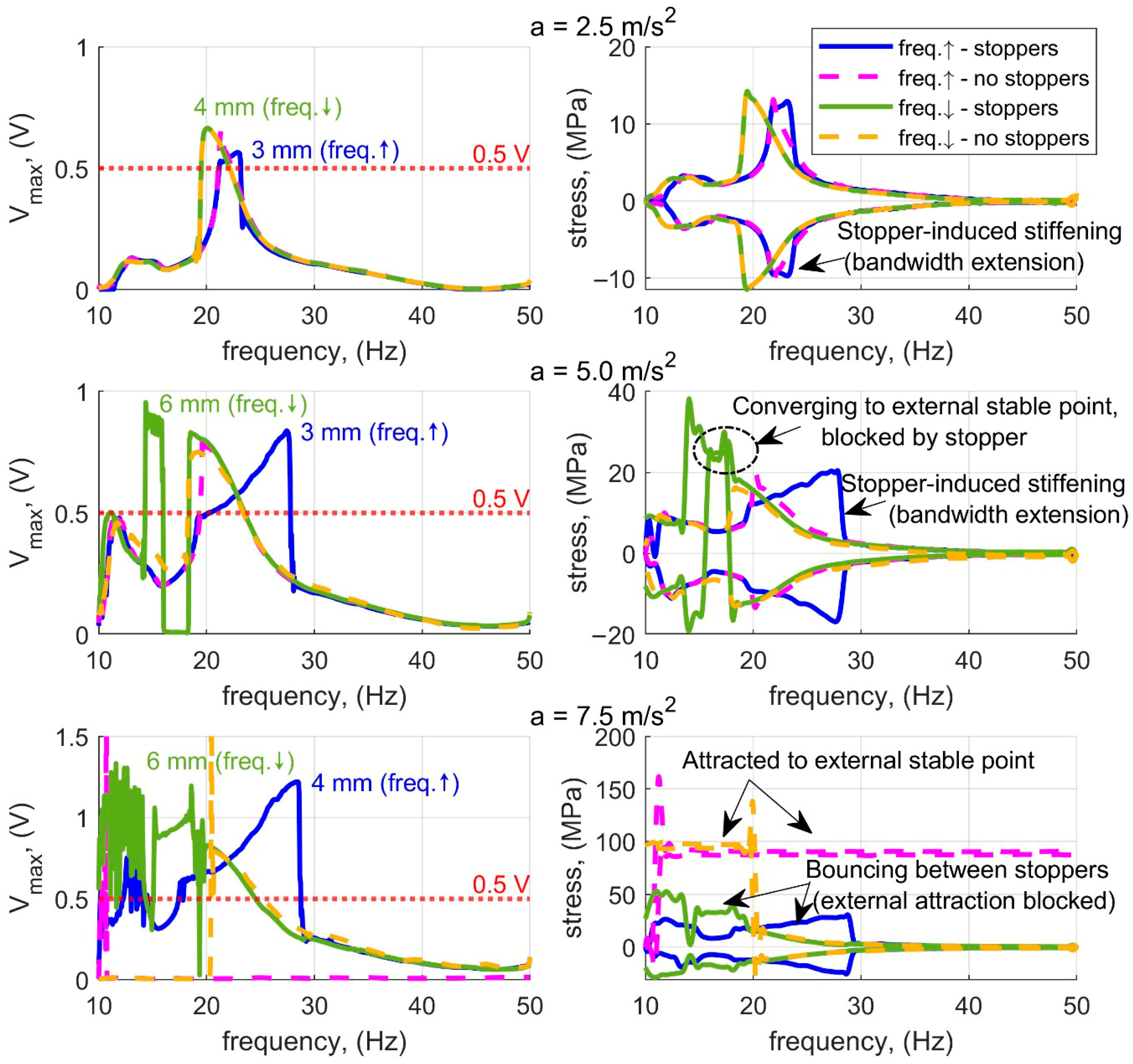 - Bandwidth enhancement:The use of mechanical stoppers resulted in a notable extension of the operational frequency range—up to 14 Hz in the optimal configurations at higher excitation levels. The introduction of adjustable stoppers increased the effective operational bandwidth for excitation levels of 5 m/s2 and 7.5 m/s2. At 2.5 m/s2, the optimal stopper configuration produced performance comparable to the system without stoppers, yielding a bandwidth of 2.6 Hz and an average output voltage of 0.61 V. For 5 m/s2, the bandwidth expanded from 5 Hz to 7.5 Hz (a 1.5× increase) and the mean voltage rose from 0.70 V to 0.77 V (a 1.1× improvement). At 7.5 m/s2, the bandwidth broadened from 6 Hz to 14 Hz (a 2.3× increase) and the mean voltage increased from 0.55 V to 0.85 V (a 1.5× improvement). These results confirm that proper selection of stopper spacing not only stabilizes the dynamic behavior of the system but also enhances its broadband energy conversion capability.