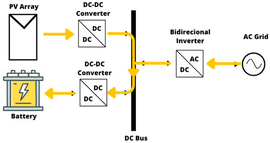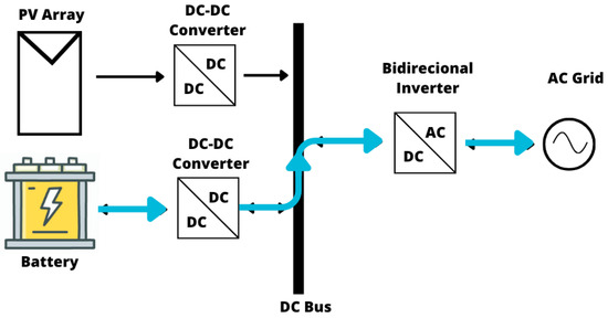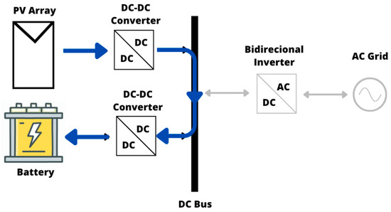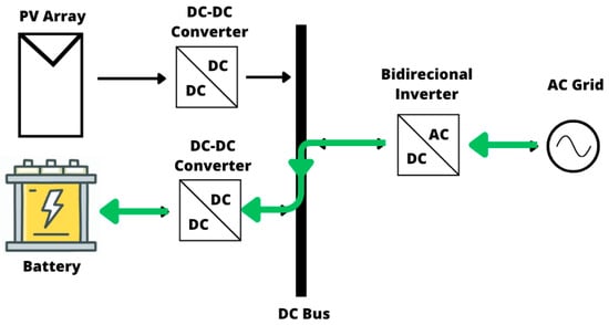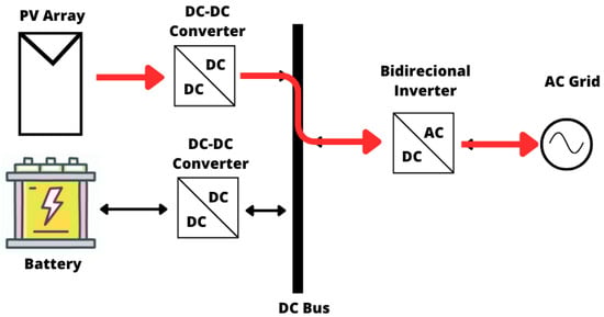 Figure 4 illustrates the operating mode of a hybrid system, in which energy flows from the photovoltaic system to the storage system. Figure 5 shows the charging mode of the storage system through the power flow from the AC grid. In Figure 6, it is possible to observe the charging of the storage system through the combined energy flow from the photovoltaic generation system and the AC power grid. Figure 7 depicts a photovoltaic system injecting electric power into the AC grid, similar to a grid-connected PV configuration, while Figure 8 presents the power injection from the storage system into the grid.