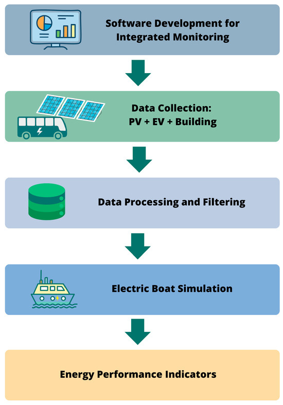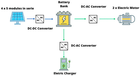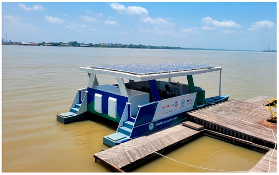According to [40] considering the boat’s operational characteristics, full operation requires a total of 75.43 kWh, of which 28.2 kWh are generated by the photovoltaic system installed on the catamaran’s surface.