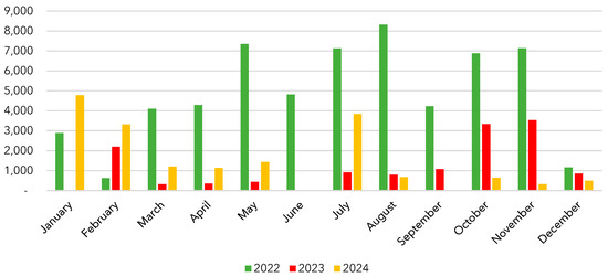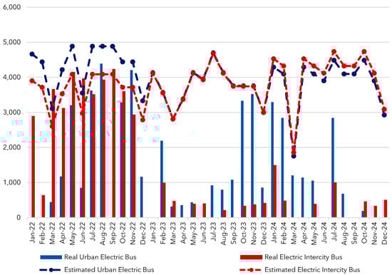 Despite the limited availability of data for developing a full annual consumption plan, an estimated monthly consumption was calculated for each electric bus from 2022 to 2024. The estimation was obtained by multiplying the annual average daily consumption of each bus by the number of operational days in each month, according to the academic calendar. Figure 20 presents both the measured and estimated annual consumption for the EBs.