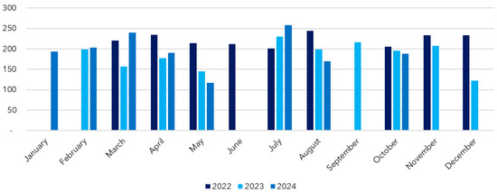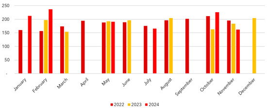 In addition, by analyzing energy consumption, it is possible to calculate the energy autonomy of buses based on the distance/energy ratio over the study period. Table 3 shows the annual values for 2022, 2023, and 2024, as well as the average for the period.