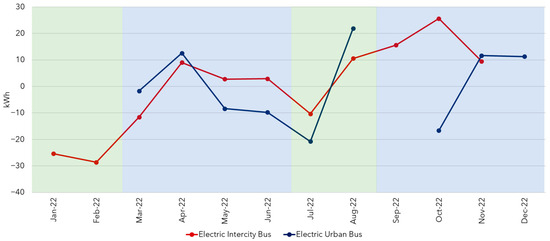 For urban bus, the efficiencies observed in 2022–2023 (0.63–0.66 km/kWh) are lower, which is consistent with the urban operating profile: internal traffic, short distances and multiple stops, low average speed, high occupancy, and, consequently, greater use of the air conditioning system. In 2024, there was a jump to 0.84 km/kWh, possibly associated with operational changes, i.e., more fluid routes, fewer stops, and lower occupancy, due to a sudden change in the academic calendar.