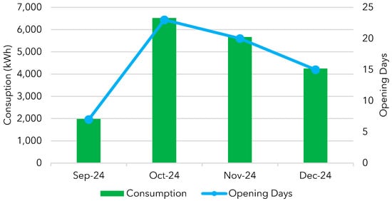 From Figure 19, it can be seen that the lowest consumption levels occurred in January, February, and July, which correspond to the intensive academic periods (in green), while the highest values were recorded in March and October, during the extensive periods (in blue). Since all courses are in regular session during the extended period, it is assumed that a larger number of users depend on electric buses. On the other hand, during intensive periods, many programs reduce their academic activities, resulting in lower demand for local transportation. These characteristics emphasize the influence of low- and high-demand academic periods on the energy planning of electric mobility projects.