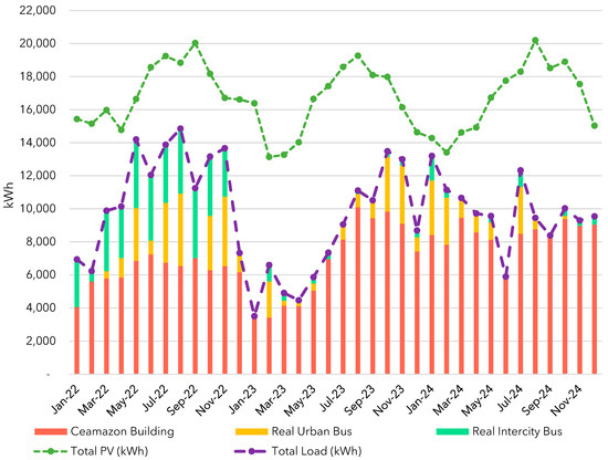 Figure 22 presents the energy balance of the SIMA project, showing that the actual loads remain well below the total energy generated by the photovoltaic systems. Nevertheless, when the estimated consumption of the EV loads is taken into account, the 2024 scenario no longer exhibits the same level of comfort observed during the project’s initial years. In several months, the estimated monthly consumption exceeds the monthly generation, indicating the need for energy supply from the grid.
