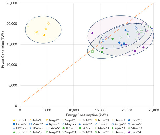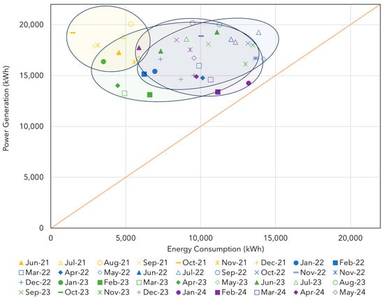 In the energy efficiency analysis of the project, the first case is presented in Figure 23, where it can be observed that the energy generation exceeds the system’s load consumption for all months across all years. All values are positioned above the orange line, which represents the balance point between generation and consumption. Therefore, the farther above this line the values are, the greater the monthly energy surplus.