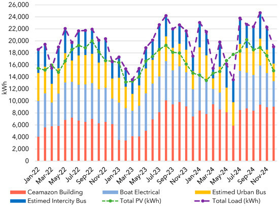 In the real operating scenario, total consumption reached 369.67 MWh, with 70% corresponding to CEAMAZON and 30% to electric vehicles. Photovoltaic generation exceeded the load in most months, resulting in a renewable energy surplus of 364.93 MWh. In contrast, the estimated scenario, which considered full EV operation according to the academic calendar, projected a total load of 713 MWh, with 36% attributed to CEAMAZON and 64% to electric vehicles. Annual energy deficits of 83.93, 111.42, and 181.47 MWh were identified for 2022, 2023, and 2024, respectively. These findings highlight the need to expand the photovoltaic system or replace the existing 335 Wp modules to maintain a positive energy balance as transportation demand increases.