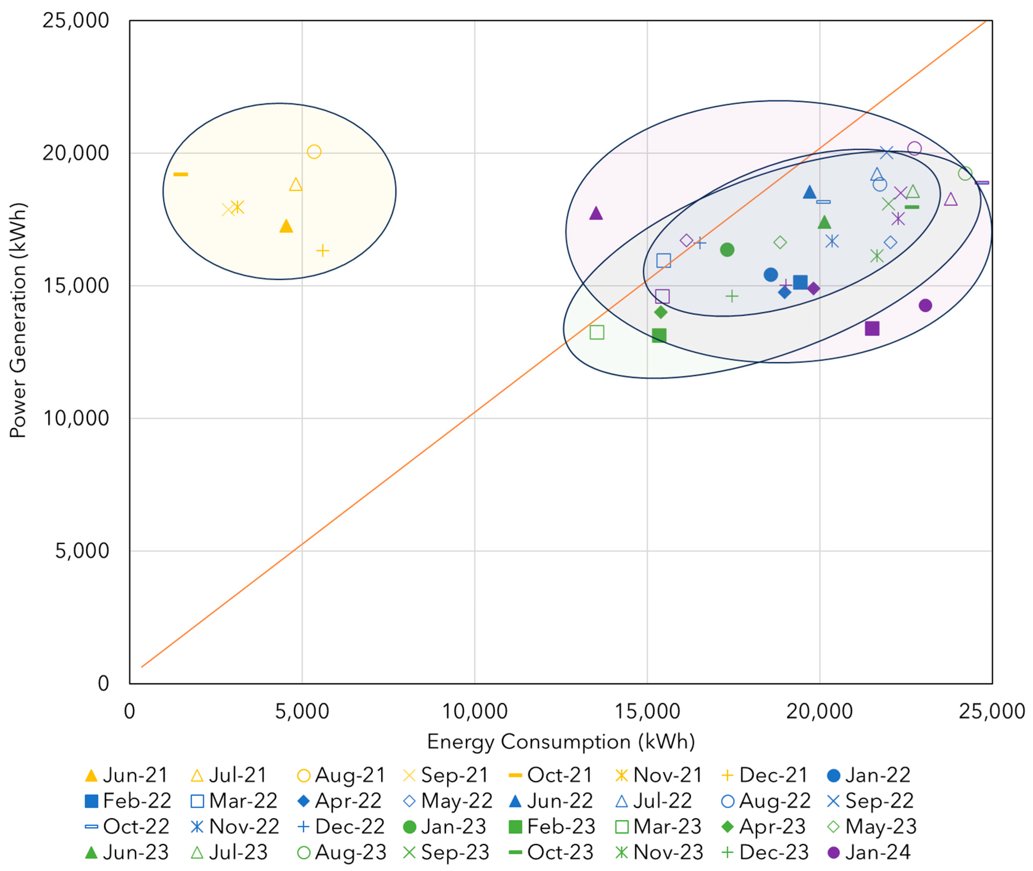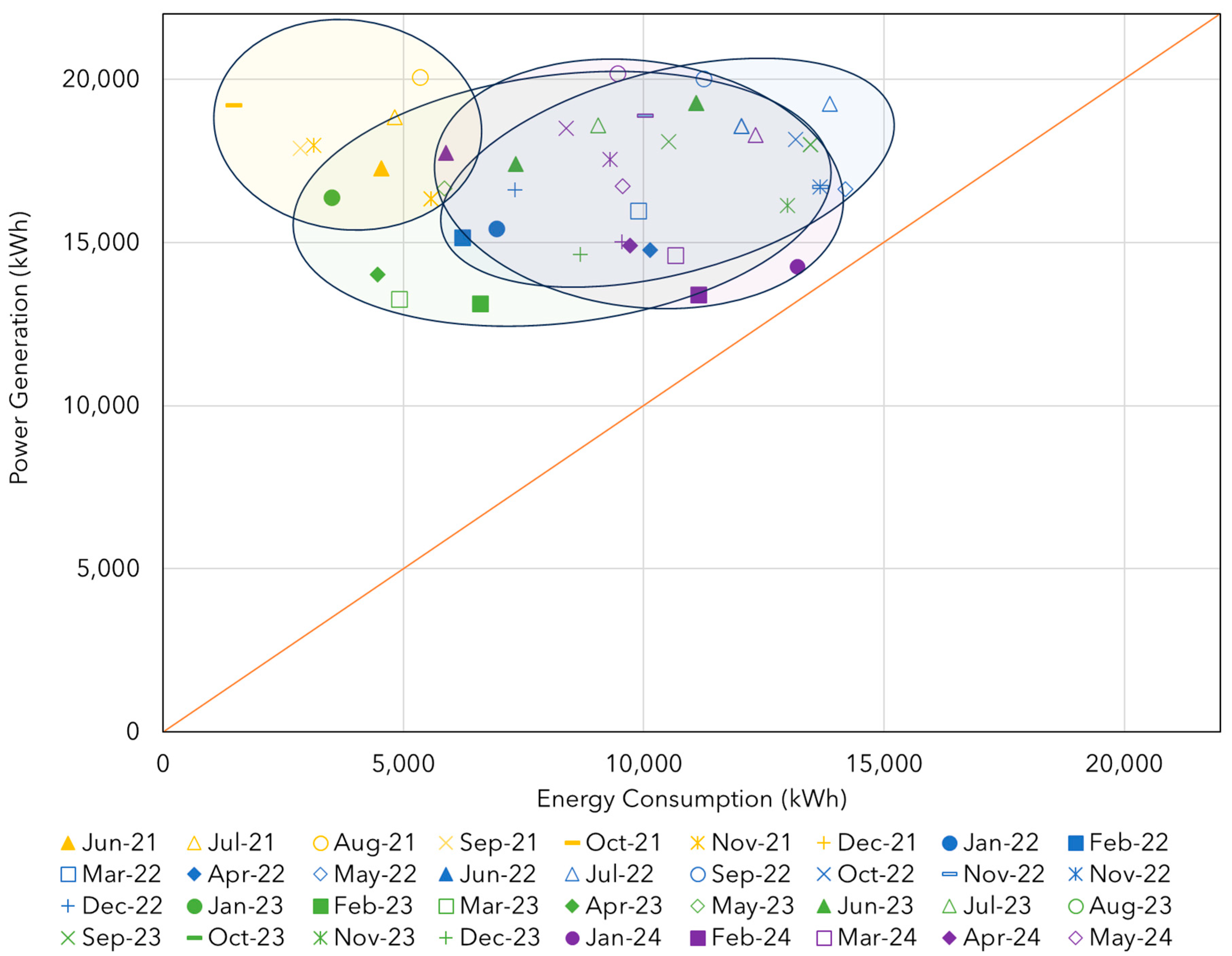 | : Photovoltaic surplus. : Monthly photovoltaic generation equals consumption. : Photovoltaic deficit. |