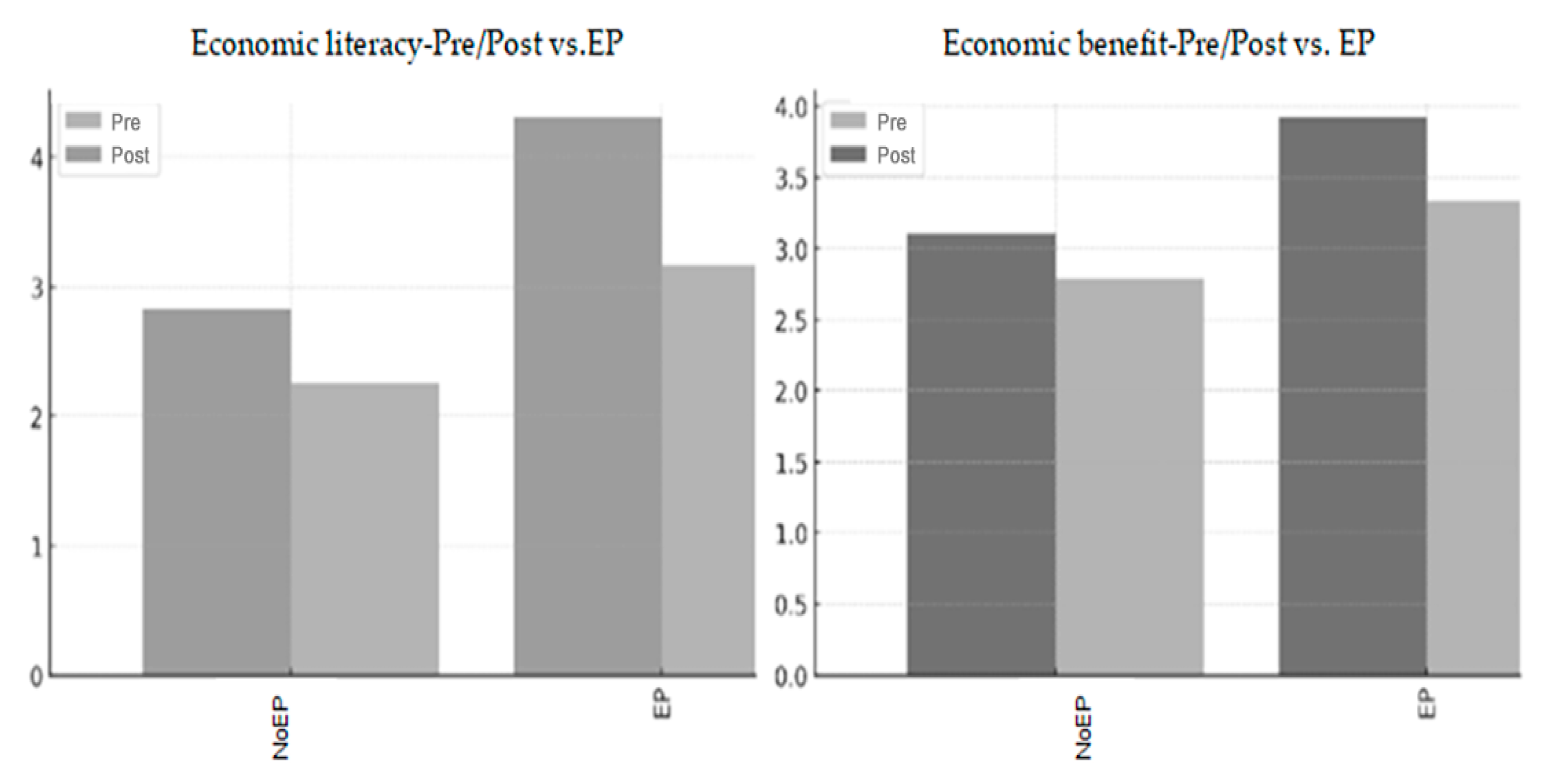 As a result, triangulation of the three levels revealed a consistent picture: entrepreneurship education enhances sustainable development through two complementary mechanisms—increasing self-efficacy and reducing perceived risk. The integrated results showed that students participating in the EP courses had a 28% higher confidence in renewable energy technologies and a 35% higher level of declared willingness to undertake environmental initiatives compared to the control group. Qualitative data further demonstrated that the teaching context plays a key role—the presence of industry practitioners, contact with real-world projects, and mentoring support.