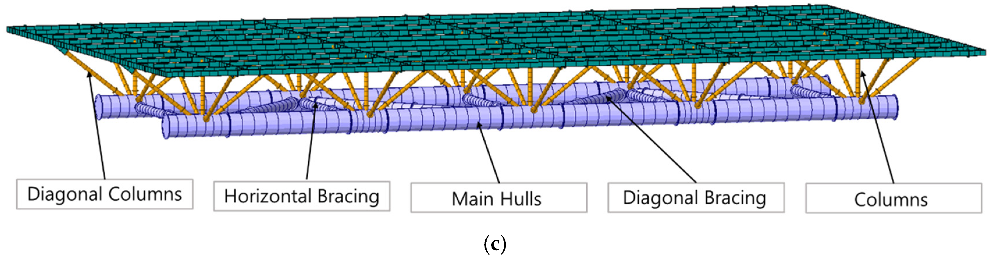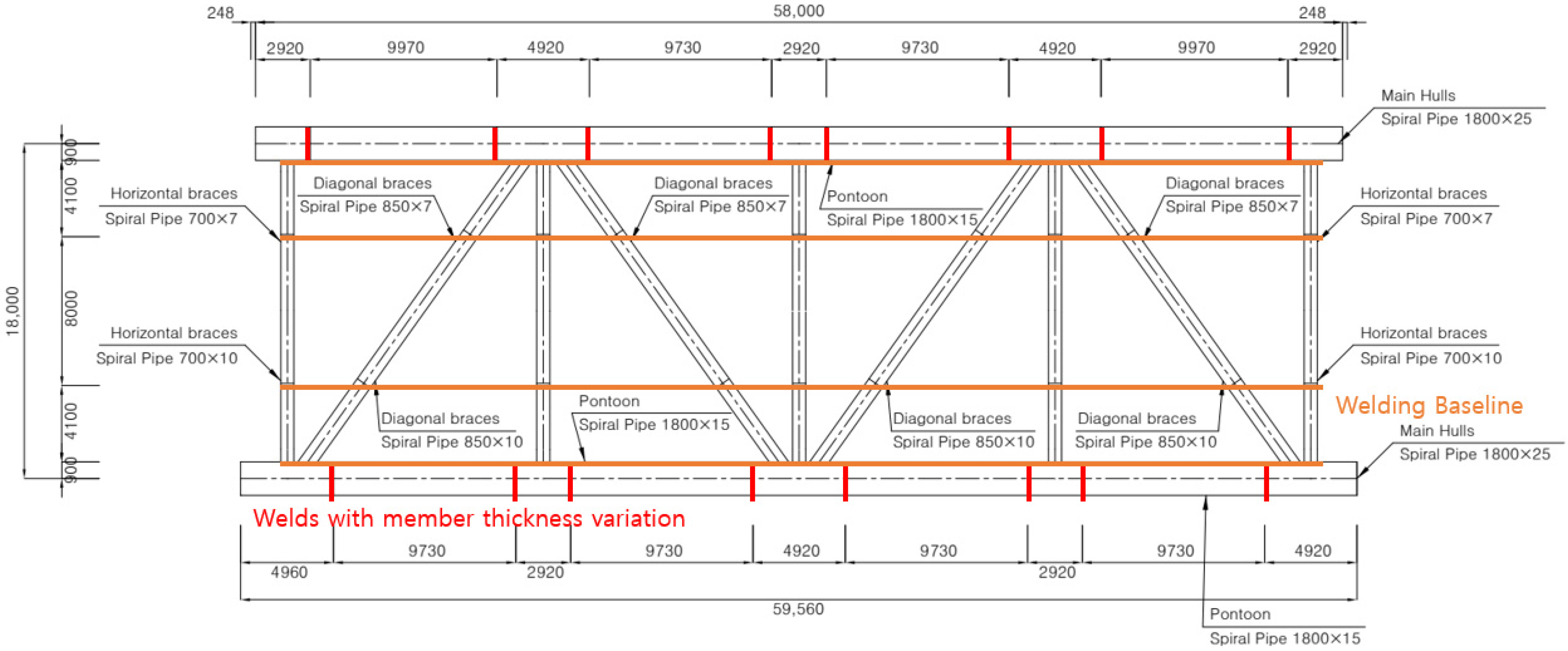 | Diagonal Bracing | Ø500~900 × 18,000 | 5 | Functions as a reinforcement member connecting the two hulls and enhancing resistance to horizontal loads. It distributes external forces from marine environmental loads such as waves, currents, and wind, and controls relative movement between hulls to prevent fatigue damage. |