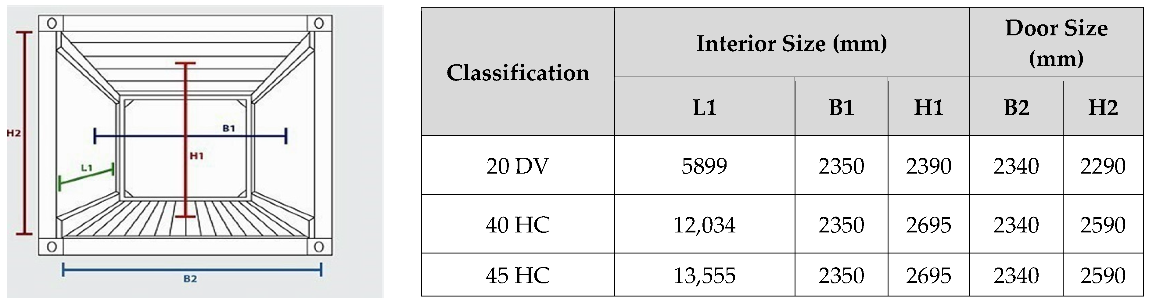 - ISO 668:2020; Series 1 Freight Containers Classification, Dimensions and Ratings. ISO: Geneva, Switzerland, 2020.