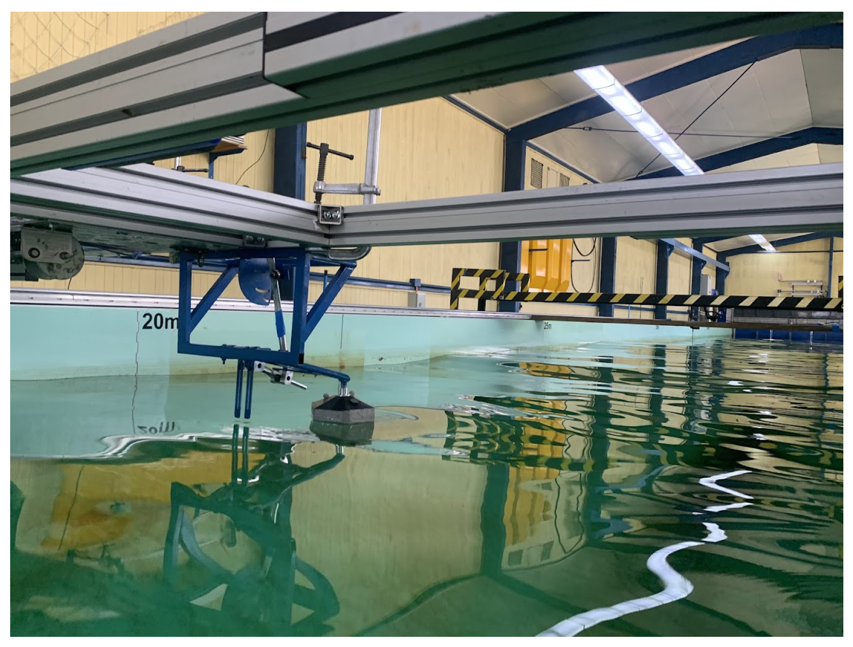 The experimental tests were conducted in the Wave/Towing Tank of Universidad Austral de Chile (CEH–UACh), a 45 m long, 3 m wide, and 2 m deep facility with an operational water depth of 1.7 m. Wave reflections were minimized through an active absorption system at the paddle and a passive wave-energy dissipation structure at the opposite end, ensuring stable wave conditions throughout the tests. The WEC motion was measured using a Qualisys motion-tracking system operating at a sampling rate of 200 Hz, with a calibration residual less than 2 mm. Reflective markers were attached to the buoy to accurately capture its complete motion during wave excitation, and the recorded data have been used to obtain the kinematic response of the system. Figure 1 illustrates the experimental setup and the installation of the scaled WEC in the tank.