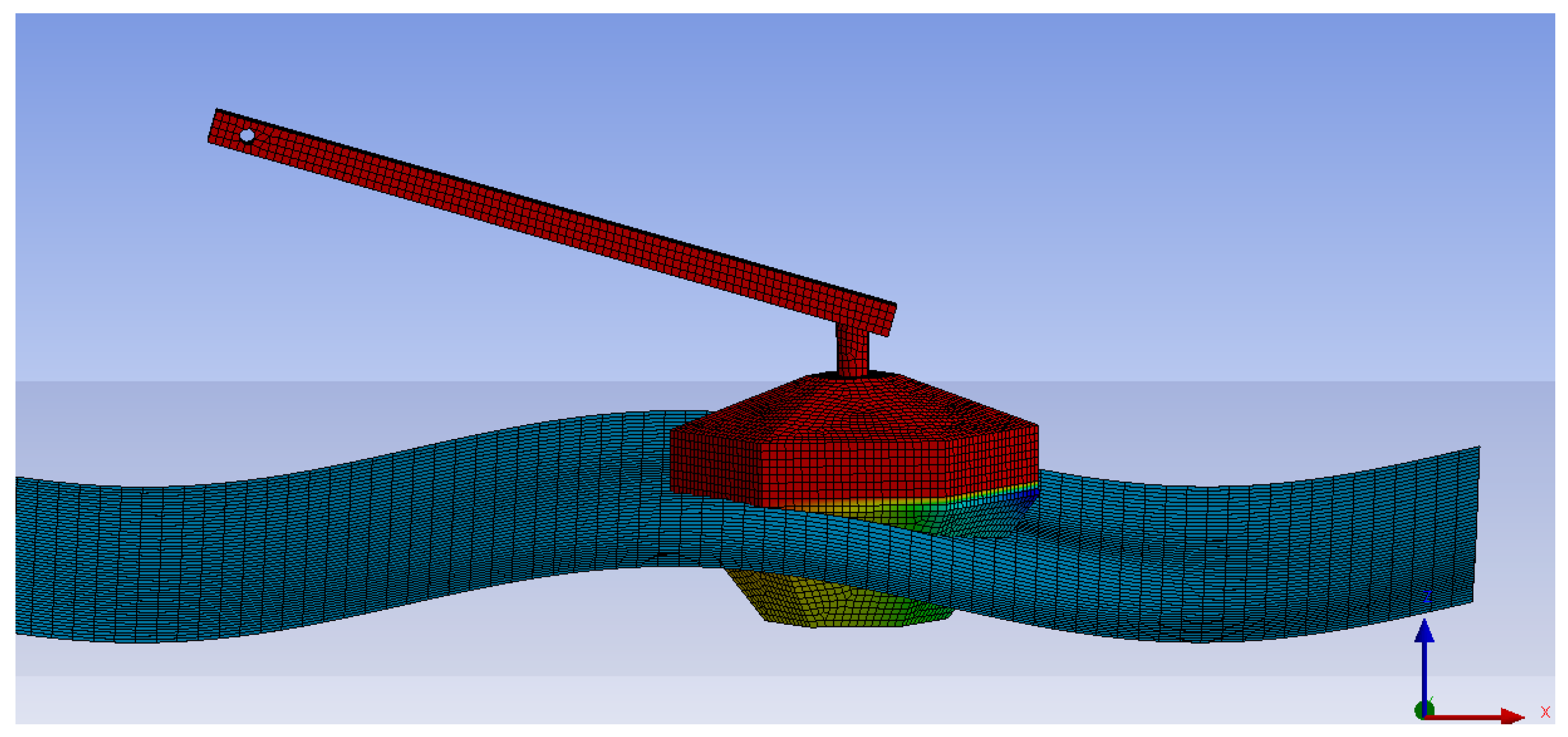 Figure 5. Example of the simulation performed in ANSYS AQWA®, showing the meshed geometry and pressure distribution on the WEC.