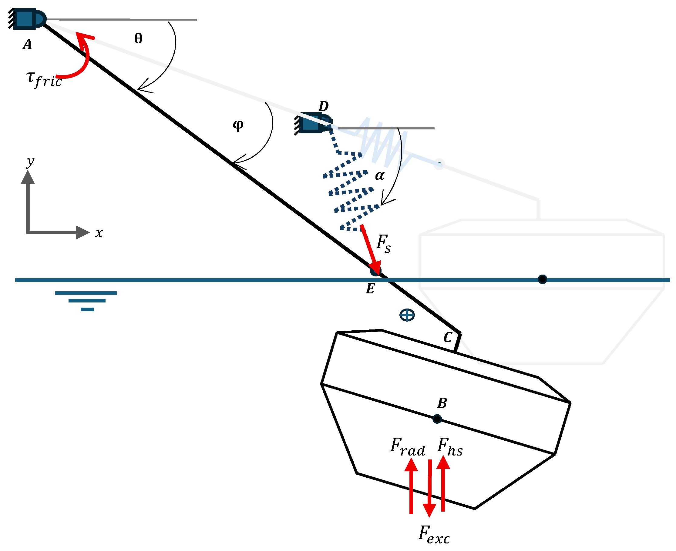 The active forces acting on the system were obtained under the assumption that the WEC submerges under wave excitation. In this configuration, the excitation force F e x c acts downward, corresponding to the instant when the wave trough passes over the buoy. The active forces acting on the WEC are illustrated in Figure 6.
