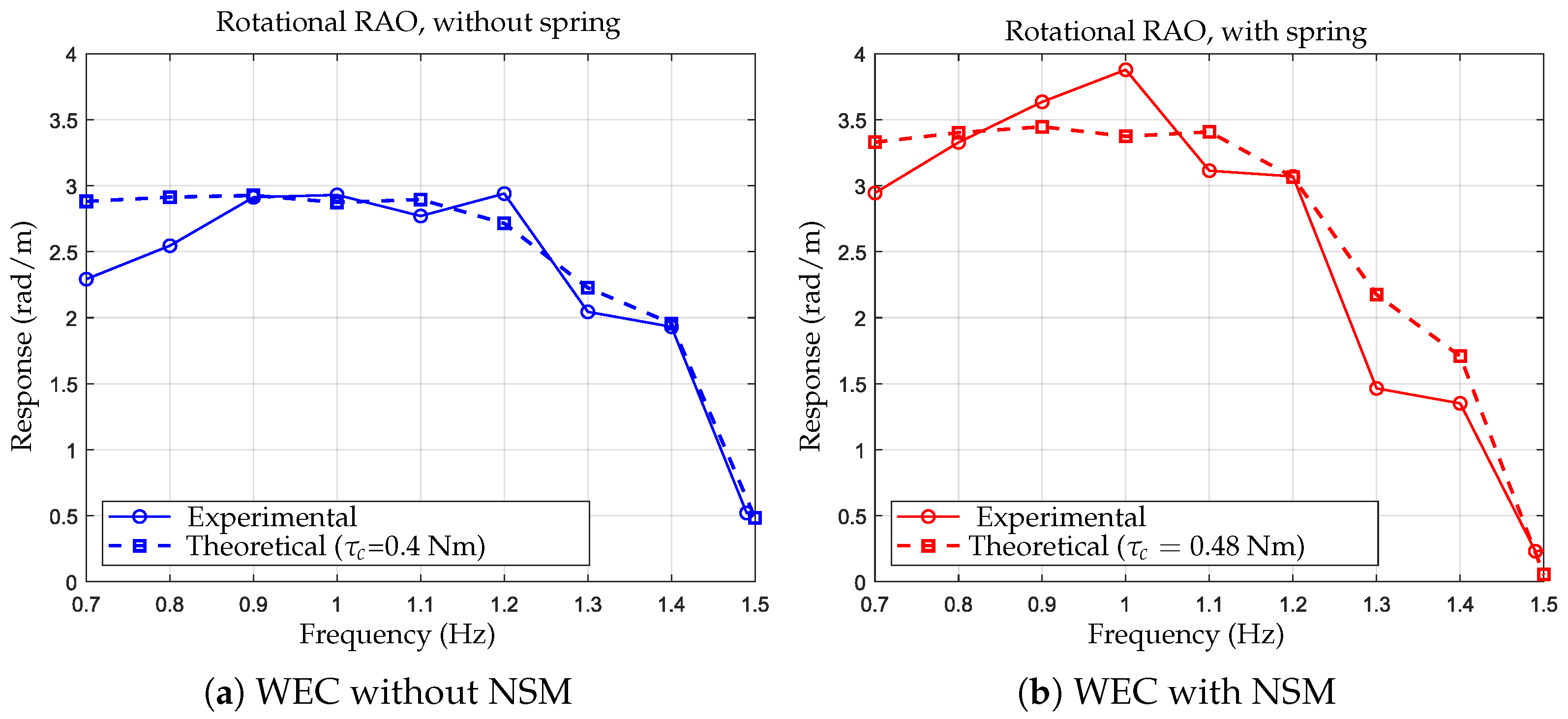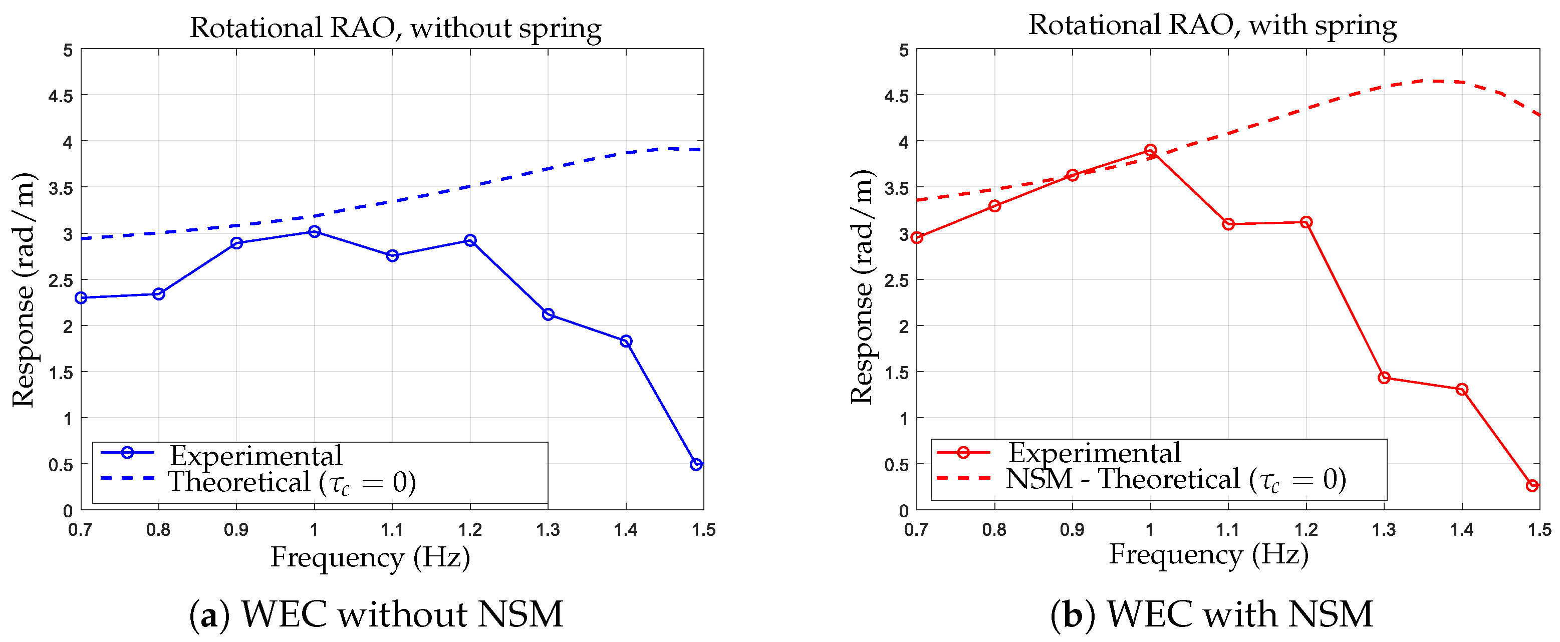 where φ is the rotational response amplitude (rad) and A w a v e is the incident wave amplitude (m), resulting in units of [rad/m]. This parameter represents the main experimental result used to compare the WEC behavior with and without the nonlinear stiffness mechanism.